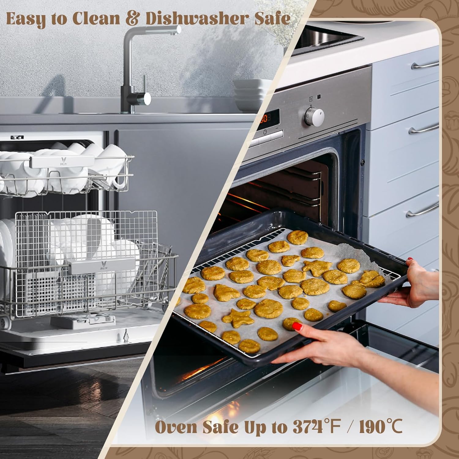 - Oven & Dishwasher Safe: Heat-resistant up to 374°F/190°C—seamlessly transition from baking to cooling, then toss in the dishwasher for effortless cleanup