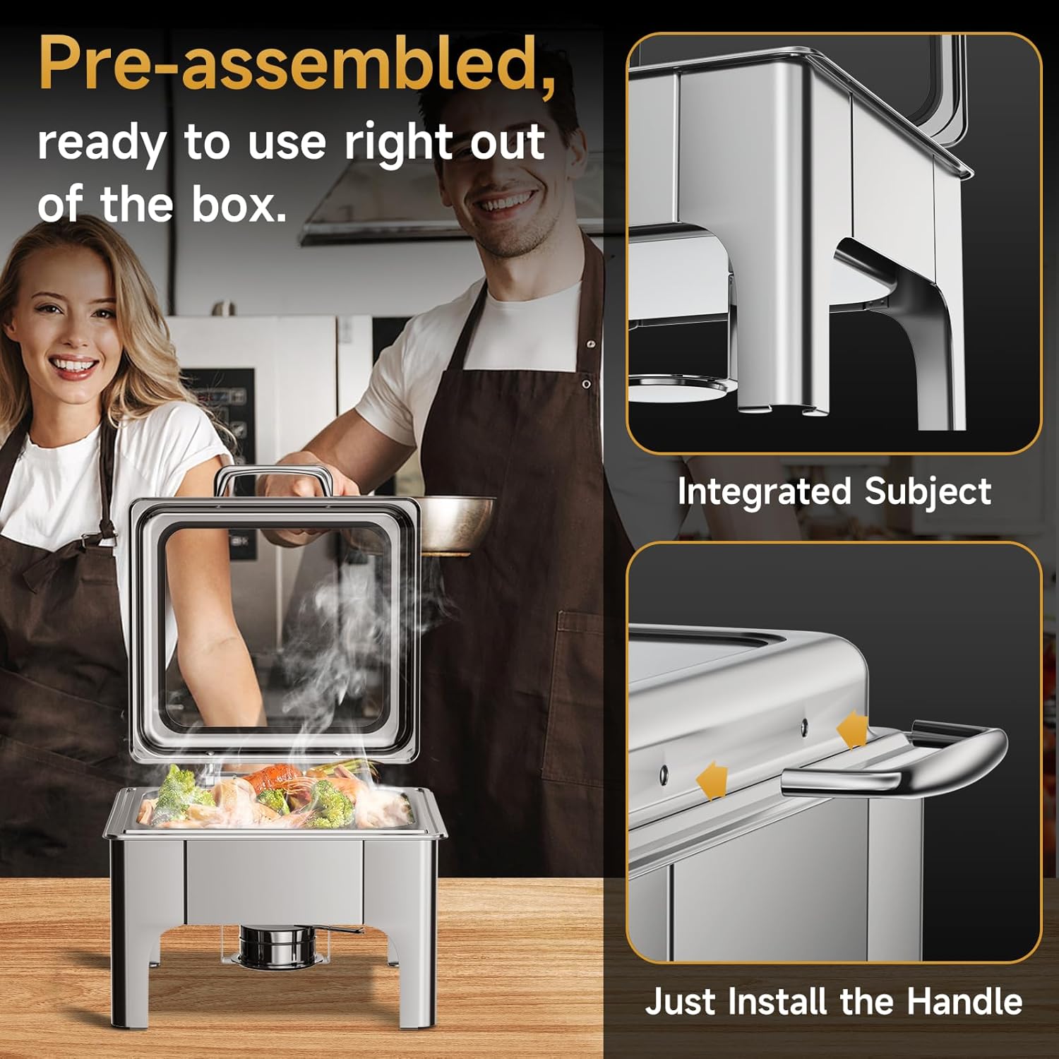 - Space-Saving 6QT Capacity โ Ideal for Smaller Gatherings Compact but capable, this square chafing dish is great for intimate parties, brunches, or small-scale catering. Easy to arrange in buffet lines.