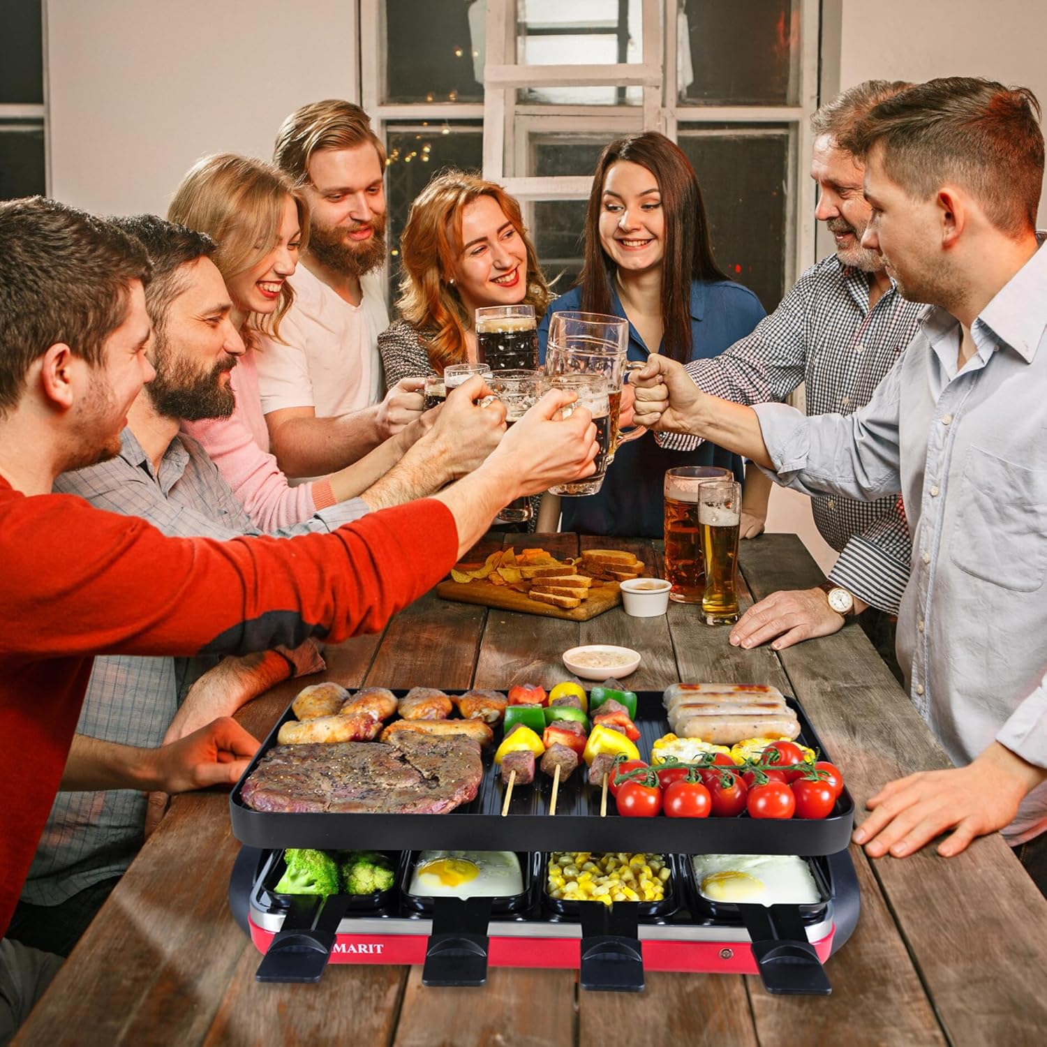 - Ultimate 8-Person Party Grill:Designed for entertaining, this raclette tabletop grill for 8 person comes complete with 8 raclette cheese pans & 8 spatulas. Perfect for family dinners, parties, or Korean BBQ nights. Grill diverse meals from breakfast bacon & pancakes to lunch sandwiches, dinner steaks, chicken, fish, veggies. Portable and compact,meet different grilling and cooking needs.