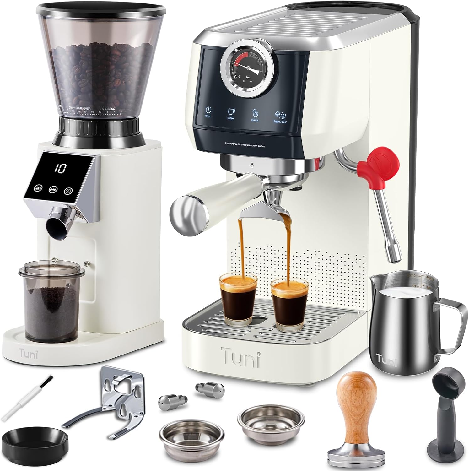 - [Package Includes & Care] 1 × Tuni Espresso Machine, 1 × Stainless Steel Powder Tamper,1 × 58mm Stainless Steel Portafilter, 1 × Single Cup Stainless Steel filter, 1 × Double Cup Stainless Steel filter, 1x Mlik Pitcher, 1 ×Spoon, 1 × Stainless Steel Steam Wand (1&2 Hole Nozzle1), 1 × Conical Coffee Grinder, 1 × Dosing Container(75g), 1 × Dosing Ring, 1 × Portafilter Holder, 1 × Soft Brush, 1 × User Manual. Tuni values your satisfaction, we're here for you whenever you need us. Purchase with confidence!