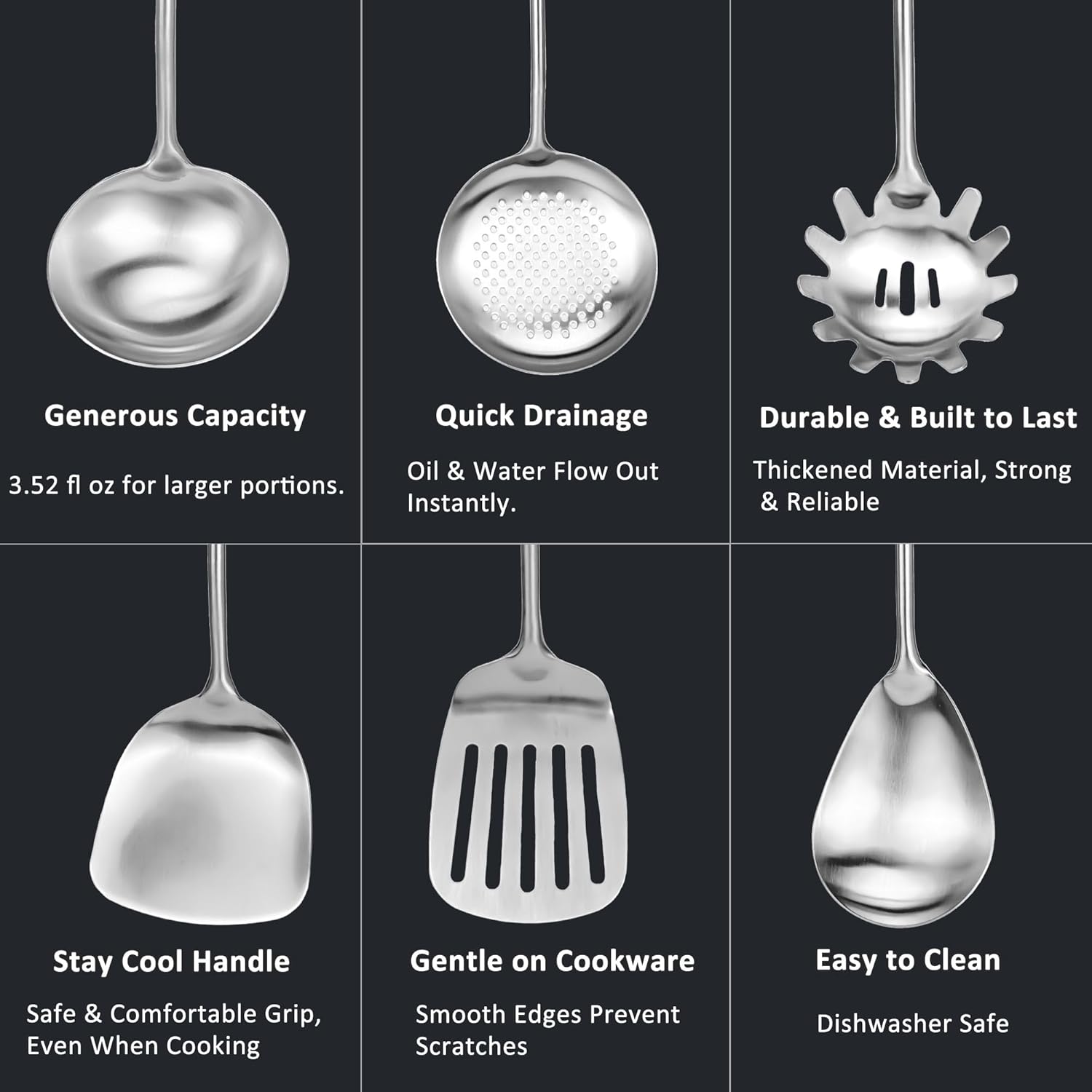 - 【Sturdy and Comfortable】Curved and smooth edges, well polished, no scratching the pans or pots. Nice weight to provide good grip. Hollow handle to provide heat insulation, safe to chef’s hands.