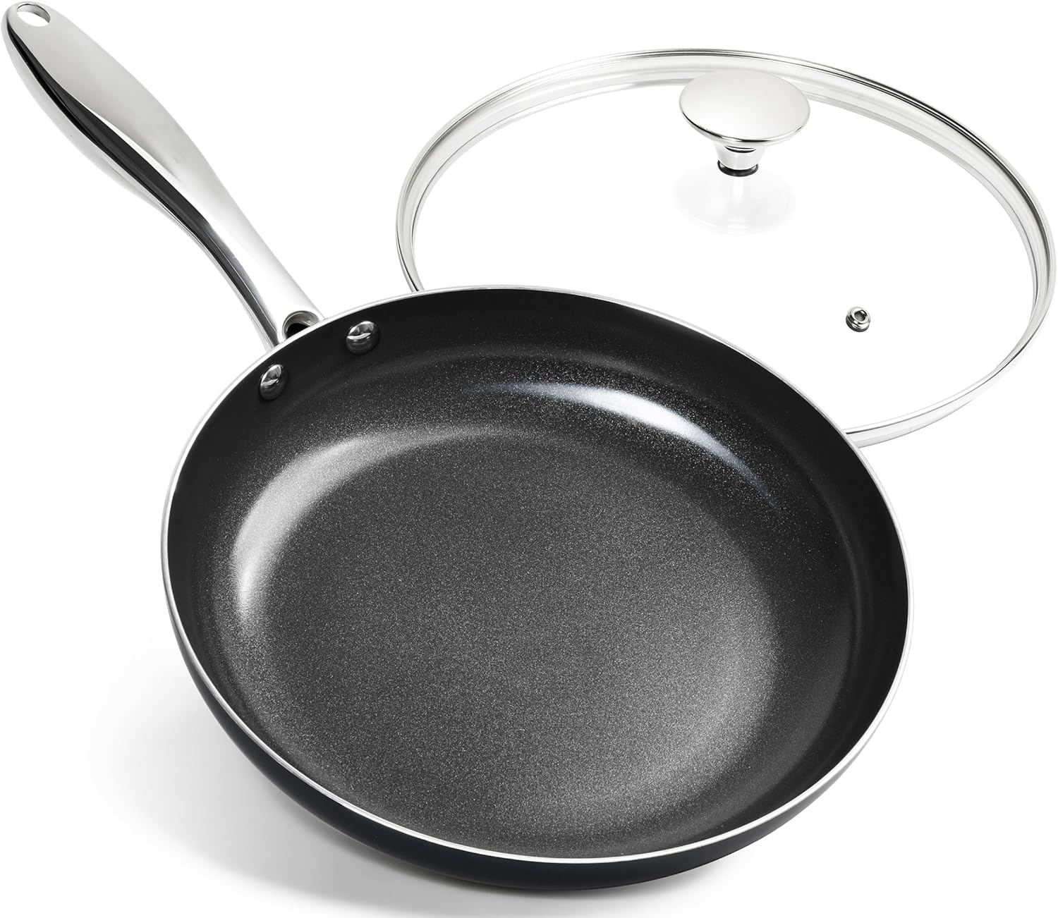 MICHELANGELO Ceramic Frying Pan - 10 Inch Frying Pan Nonstick with Lid, Non-Toxic Skillet with Stainless Steel Handle, Nonstick Skillet, Black