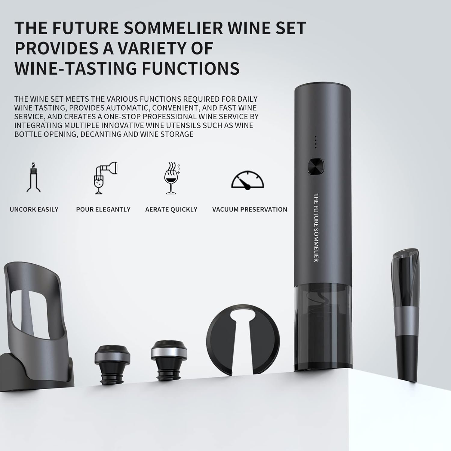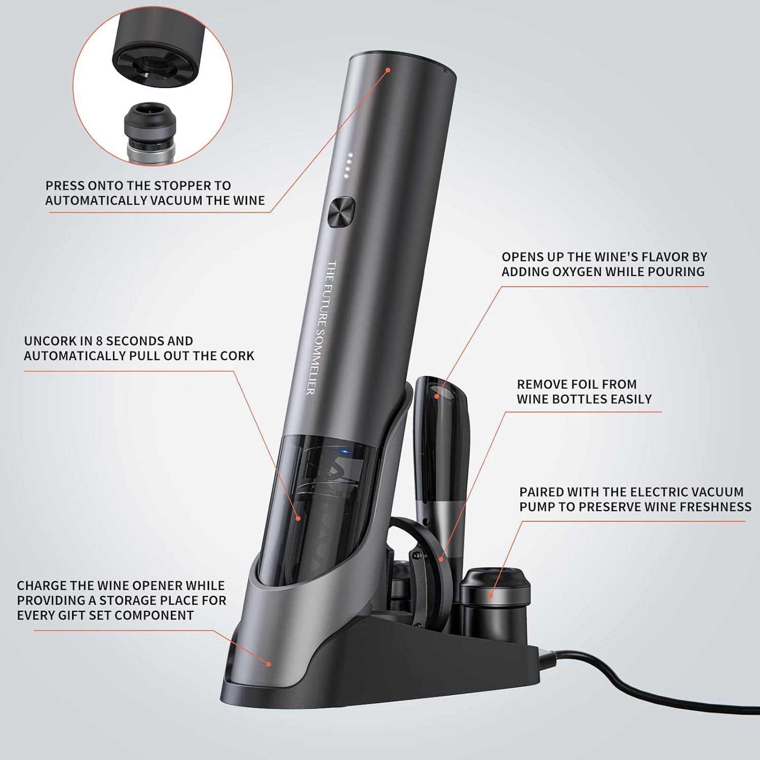 - Premium 7-in-1 Wine Kit - 2-in-1 electric corkscrew, foil cutter, aeratr pourer, 2 vacuum stoppers and a charging base, everything you need is in one set! Streamline opening, serving, aerating, and storing wine like a pro—perfect for gifting or personal use