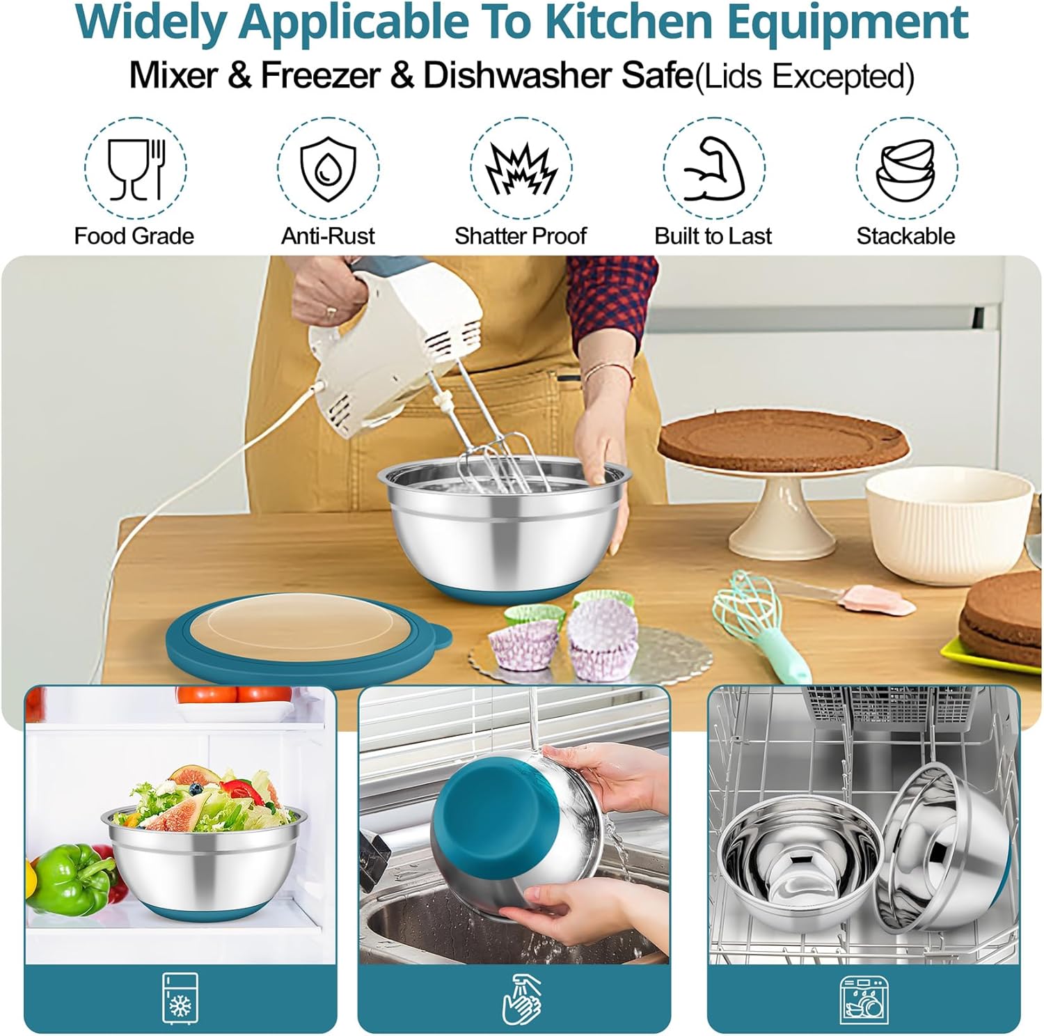 - FOOD-SAFE & LONGEVITY: Our mixing bowls with lids set is made of food grade stainless steel and non-toxic plastic lids, No harmful chemicals to ensure usersโ health and safety, Rust and chip resistant, Heavy duty construction make them not easy to break and deform, Stand the test of time and great for long-term use, A huge plus โ the bowls are oven safe except for the lids