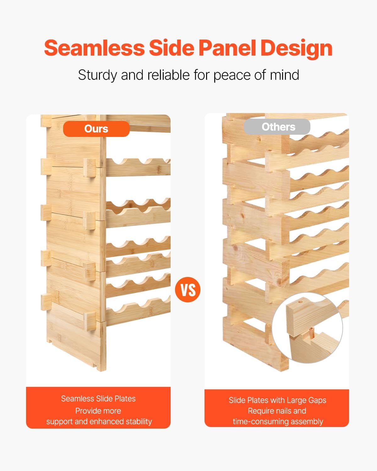 - Built to Last: Built with reinforced side panels that close any gaps and provide greater support, this bamboo wine rack provides superior stability. Its durable construction ensures it won't wobble, tilt, or collapse, keeping your collection secure