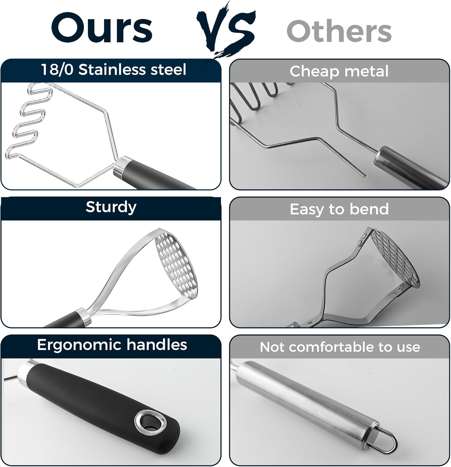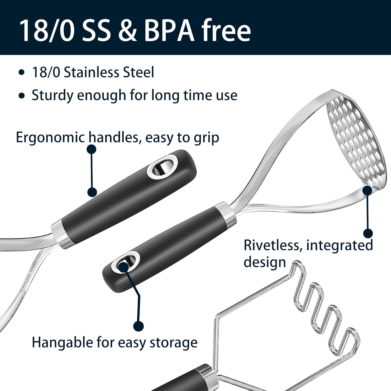 - Integrated design: No rivets ensure that the potato mashers is sturdy enough and won't fall apart after a long period of use.