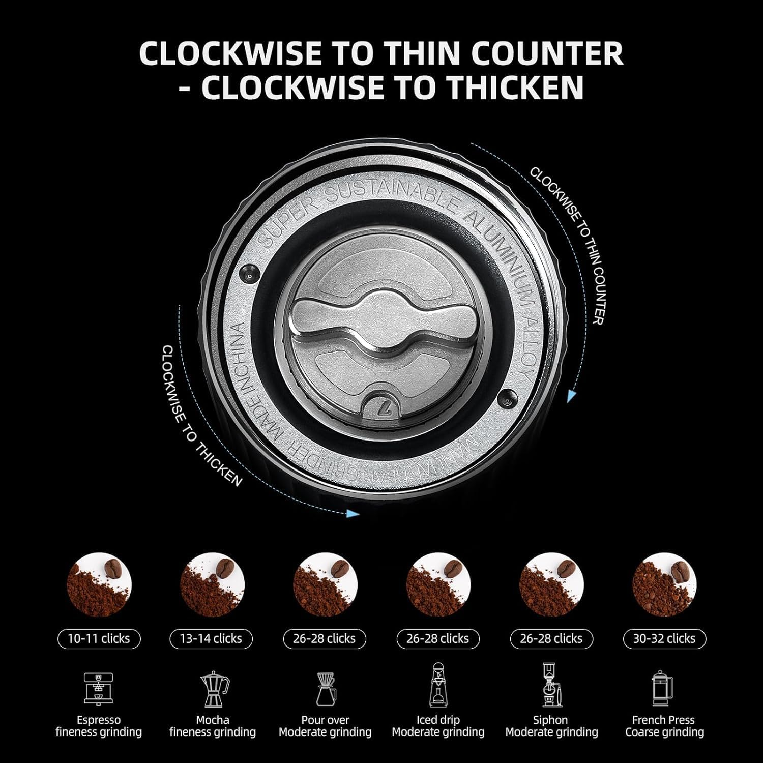 - 【ADJUSTABLE GRINDING FINENESS】 - Built-in grinding adjustment knob, with more than 56 click settings, turn the grinding knob to get the desired coffee grinding fineness, you can enjoy wonderful coffee time in your home office or outdoor camping, vacation, such as espresso .Americano .Latte . Coppuccino .Macchiato .Mocha .Pour over, drip. filter.French press , cold brew .etc.