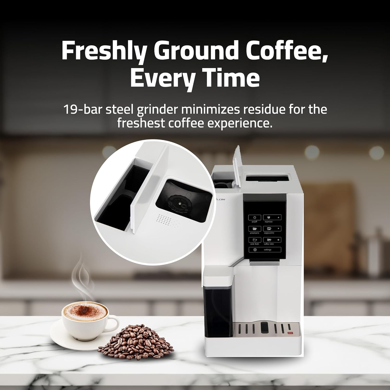 - Fully Automatic Epsilon Coffee Maker with 19 bar Grinder & Milk Frother β Enjoy quality coffee at home with this fully automatic coffee machine. Equipped with a 19 Bar compact grinder, it delivers freshly ground coffee with minimal residue. The grinder is detachable for easy cleaning, ensuring maximum freshness and flavor in every cup.