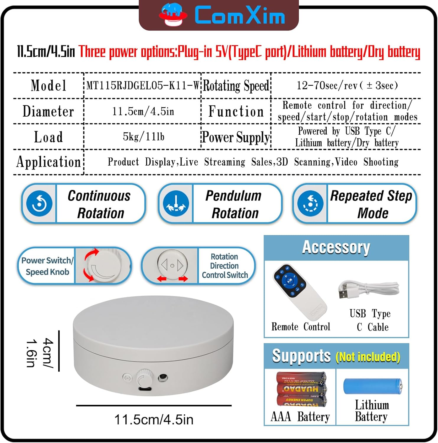 - 【Multiple professional display methods】:The diameter of the motorized lazy susan is 11.5cm/4.53inches, with a load-bearing capacity of 5 kilograms/11 pounds. The speed range is 13-70 sec/rev (±3sec). The speed can be adjusted through a knob or remote control. The bottom of the motorized display turntable is equipped with anti slip foot pads, which can come into contact with slippery surfaces.
