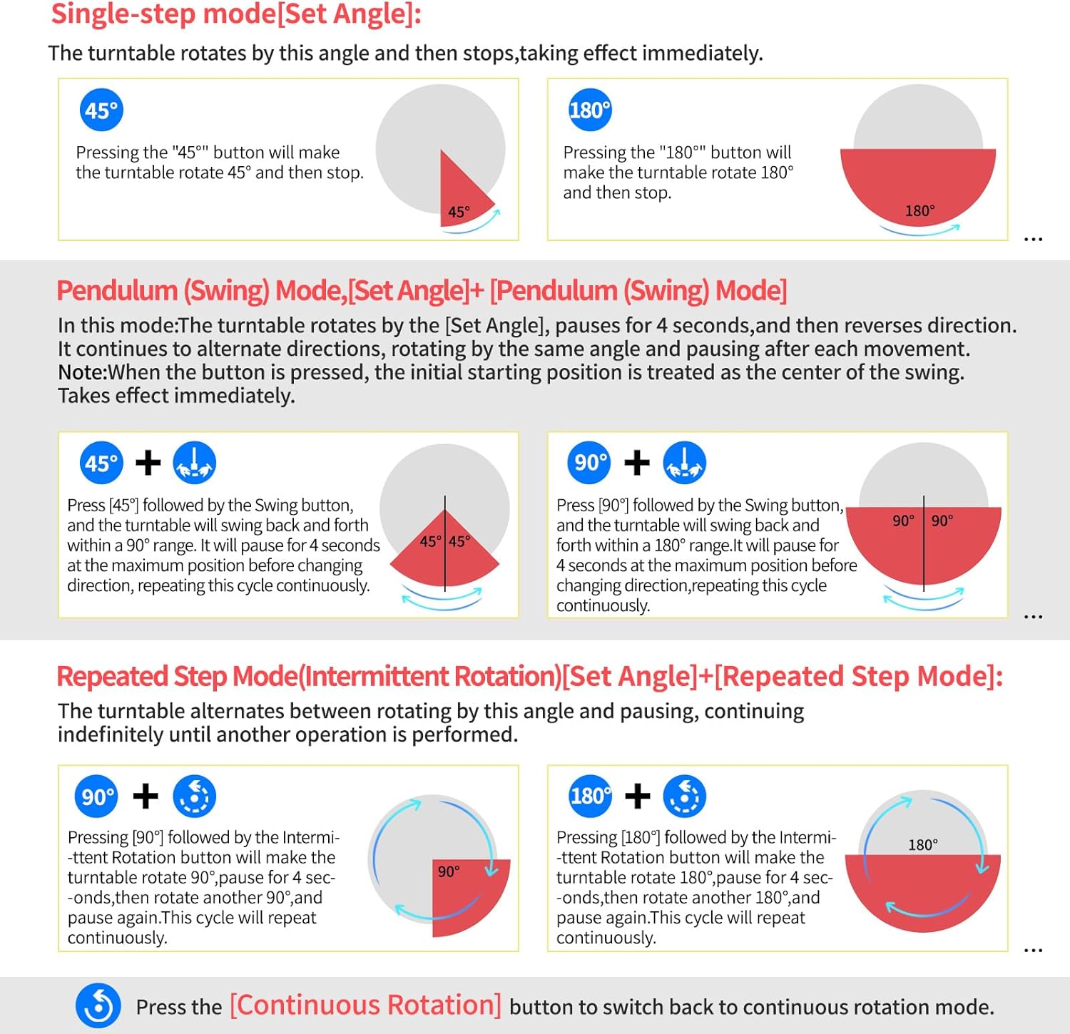 - 【Electric turntable Supports remote control of four rotation modes】: Continuous rotation. Single-step rotation at 45°, 90°, and 180°. Repeated step rotation at 45°, 90°, and 180°. Pendulum (swing) rotation at 45°, 90°, and 180°. Allows remote control for both clockwise and counterclockwise rotation. Supports remote control for start/pause and speed adjustment (increase/decrease).