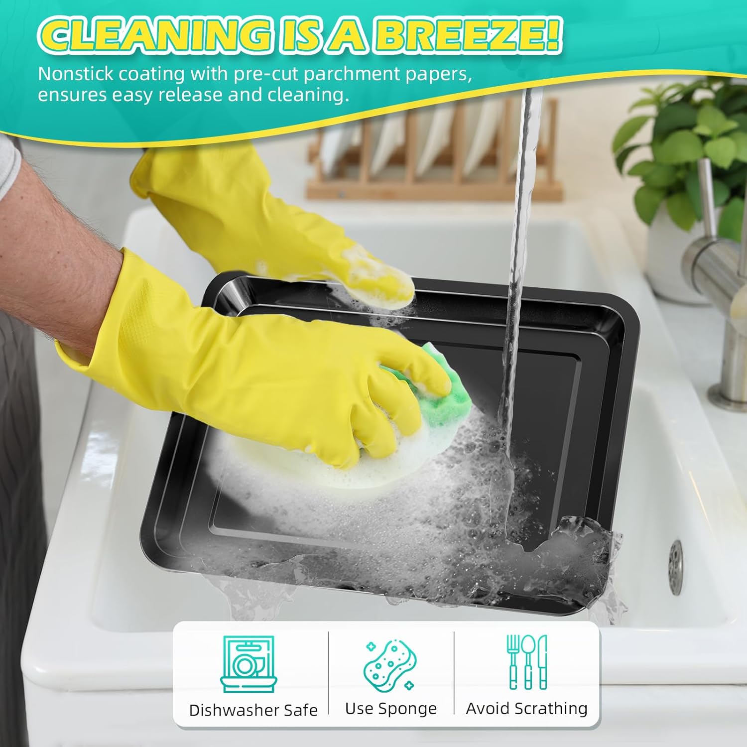 - Easy to Clean and Dishwasher-safe: Stainless steel oven air fryer basket ensures safe cooking. The package also comes with 30 pcs pre-cut parchment papers, making cleaning up after cooking a breeze. You can put the air fryer basket and tray set in dishwasher for easy clean-up, saving you time and effort. Or clean by hand.