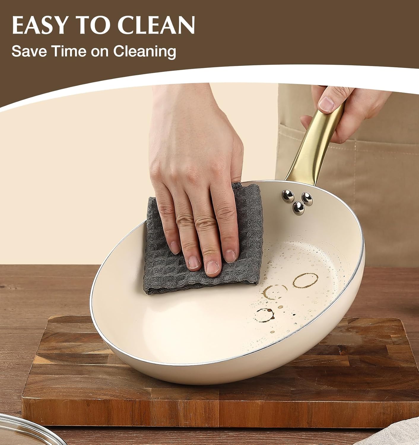 KOCH SYSTEME CS Nonstick Frying Pan with Lid, 8 Inch Non-Stick Skillet with Gold Stay-Cool Stainless Steel Handle, Omelet Pan with Nonstick Ceramic Coating, PFOA Free, Oven Safe, Cream White