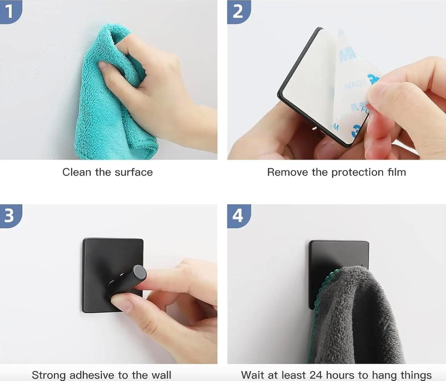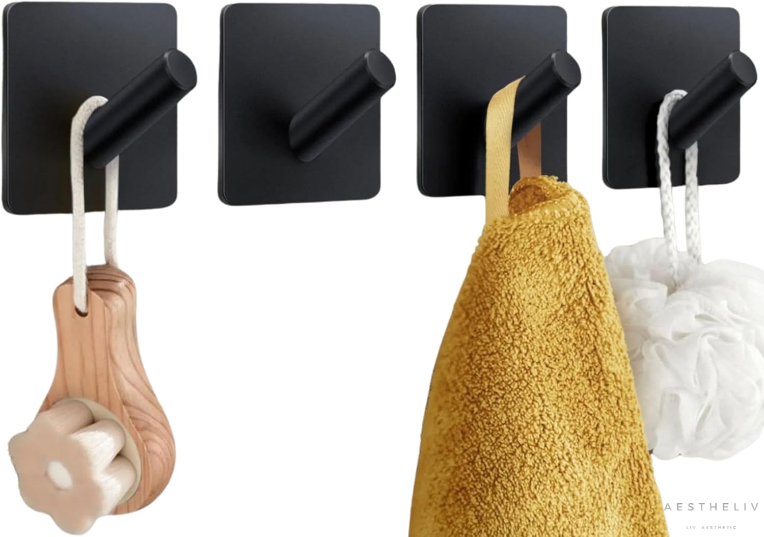 - Multi-Use Wall Hooks – Organize Every Corner of Your Home Our 4-pack of black adhesive wall hooks offers endless organization possibilities throughout your home. In the entryway, keep keys, coats, or dog leashes at arm’s reach. In the bedroom, hang accessories, hats, or bags with ease. In the bathroom, they’re perfect for towels, loofahs, and robes. The kitchen? Ideal for utensils, potholders, and cleaning cloths. Even in the garage, laundry room, or office, these hooks add functional storage without taking up space.