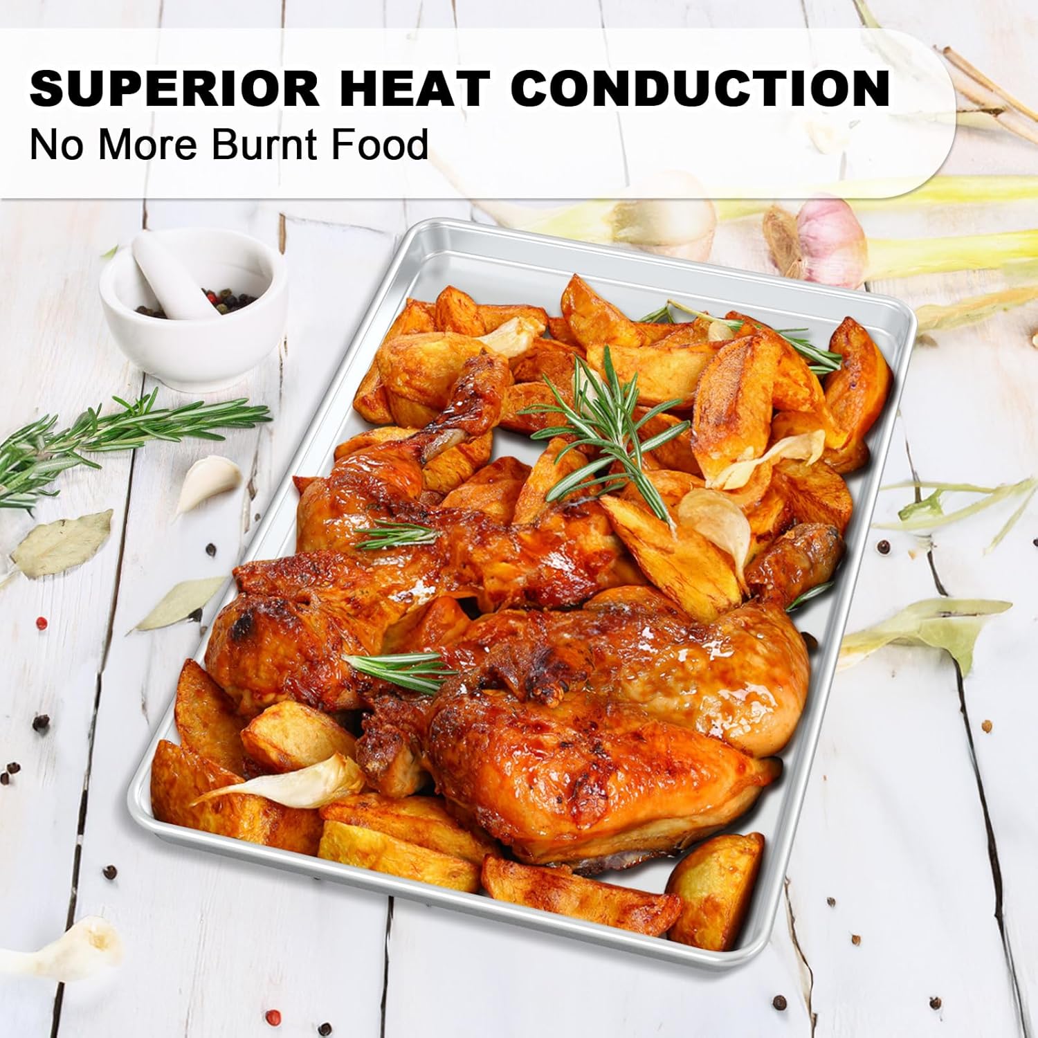 - Premium Thick Baking Sheet: Unlike other pans for baking that are too thin and warp, or have a coating that peels and rusts, Our baking tray is made of thick and heavy aluminum, with a heavy rolled edge to withstand temperatures of up to 500ºF / 260ºC without twisting or warping. Pans are made of a special hardened aluminum alloy that provides maximized scratch resistance, making them long-lasting.