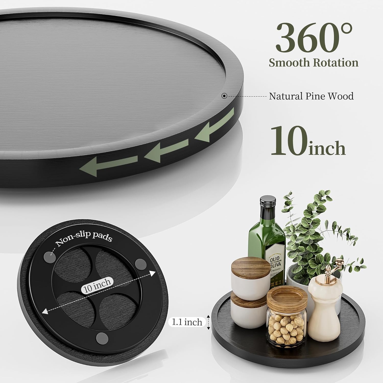 LAMU 10'' Wood Lazy Susan Organizer Turntable for Cabinet, Lazy Susan for Table Top, Pantry, Kitchen, Bathroom, Countertop, Rotating Spice Organizer, Vanity Decor Tray, Pine Wood, Black