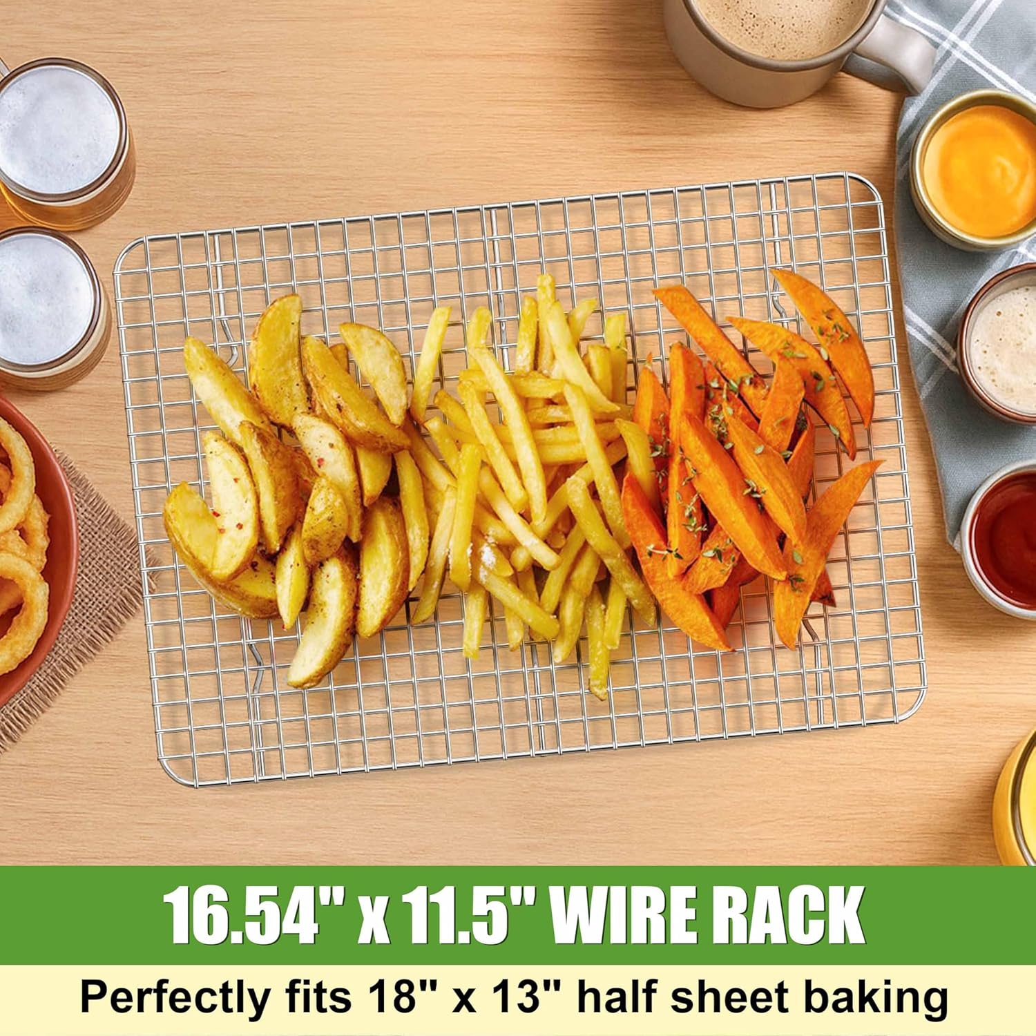 - Perfect size, 16.5" x 11.5" x 0.75" cooling racks fit perfectly inside 18" x 13" half sheet pans and they can also be used separately, the cooking racks are oven safe up to 450 Β°F so you can bake and cool the baked foods in one rack, mirror finish for effortless food release