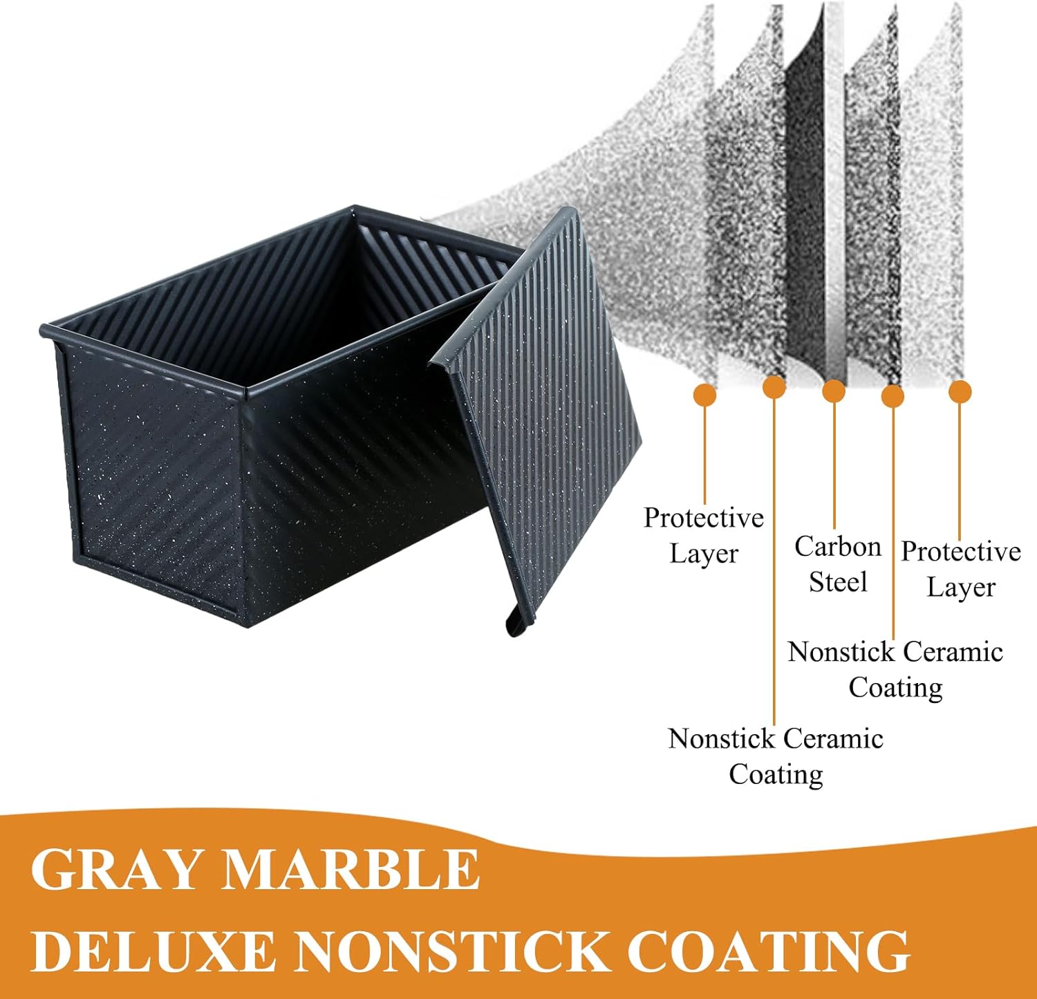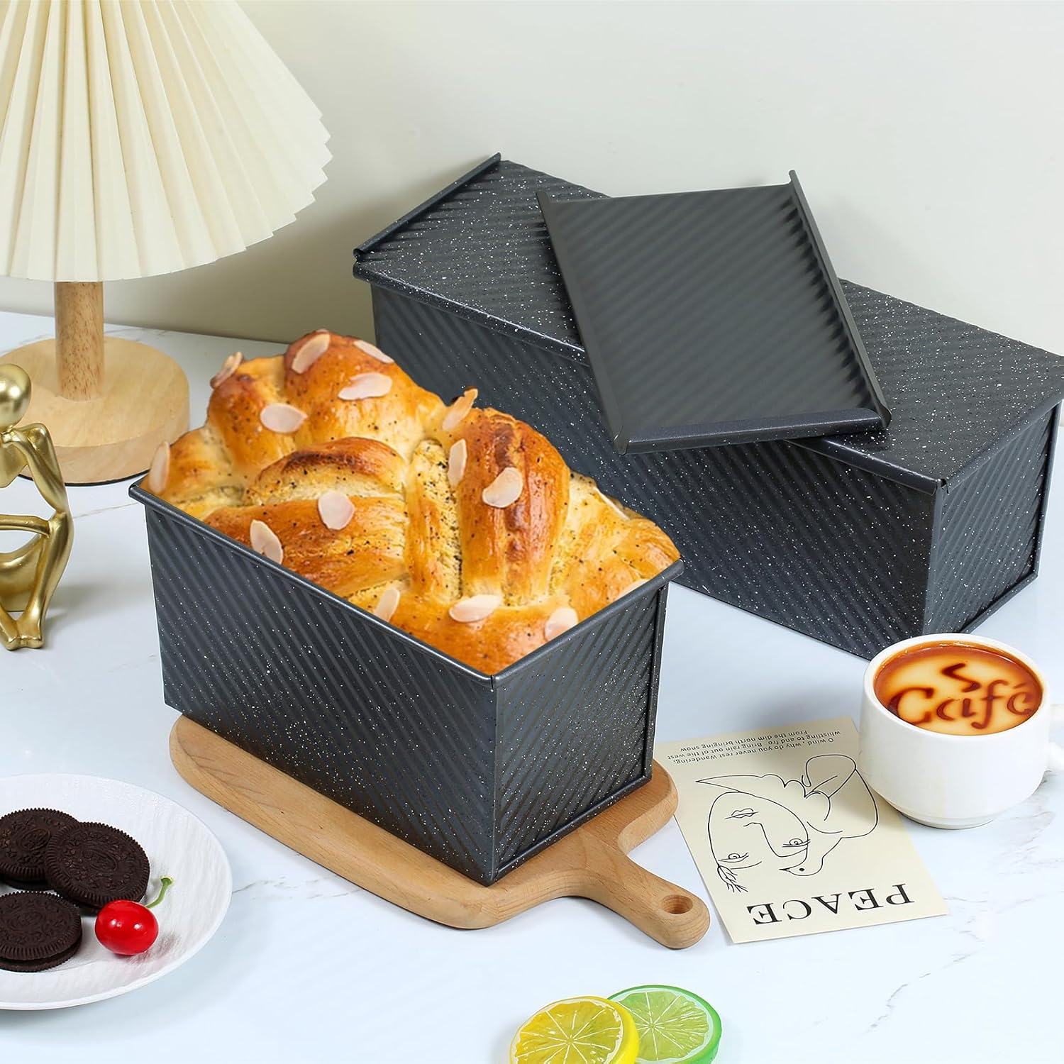 - DOUBLE CAPACITY, ENDLESS OPTIONS: Meet all your baking needs with 2 commercial-grade pullman loaf pans! The 12.5x4.8 inch pan handles 2.2lb dough for family-sized sandwich bread, while the 8.3x4.7 inch pan (1lb capacity) bakes personal sourdough loaves. Durable carbon steel construction withstands 450Β°F heat for even baking. Includes lids to lock freshness and shape perfect square loaves.