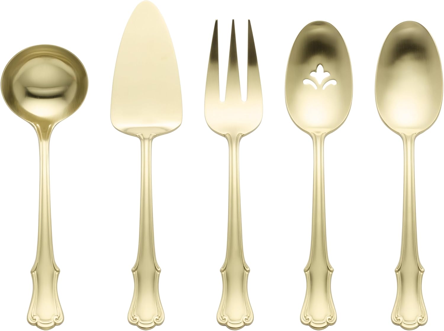 - 5-piece set includes large serving spoon, large pierced serving spoon, large serving fork, gravy ladle, and pie server