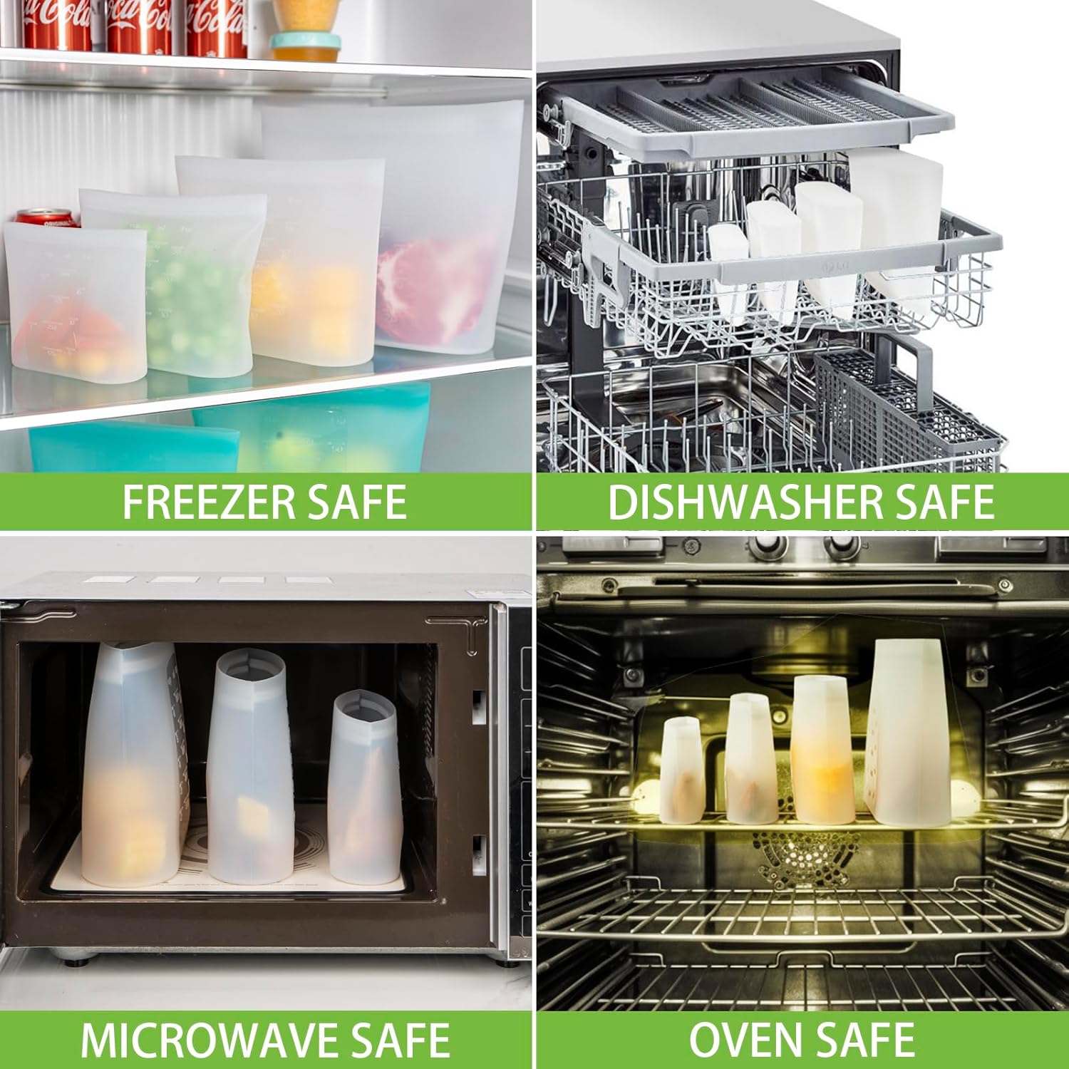 - 【DISHWASHER FREEZER MICROWAVE OVEN SAFE】Tired of plastic bags? (PEVA is still plastic.) Switch to silicone food bags for safer leftover storage. These reusable, non-toxic bags are safe for the Microwave, Freezer, Oven, and Dishwasher, withstanding up to 428℉ temperatures, ideal for all your needs. Note: The 3000ml Extra Large bag is quite tall and cannot stand upright in a standard microwave. For microwave use, please lay it flat or fold it to fit