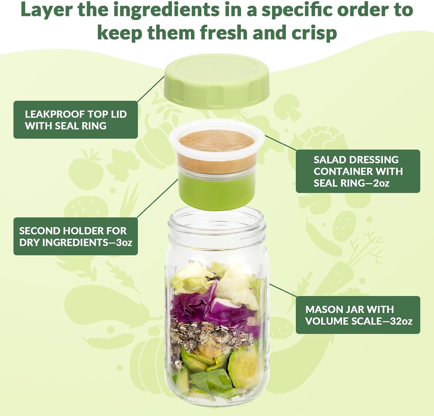 - Never Had a Soggy Salad again - The Soligt all-in-one salad jar divides the glass jar into three separate spaces with two layers of small BPA free plastic containers, the main space is used to store salad foods such as the veggies and fruits, the lower 3 ounce container is perfectly suited for putting in beans or meats, and the top 2 ounce container is provided to be used as a salad sauce box. Even pre-made salads can perfectly restore the freshness and original crispness of each ingredient!