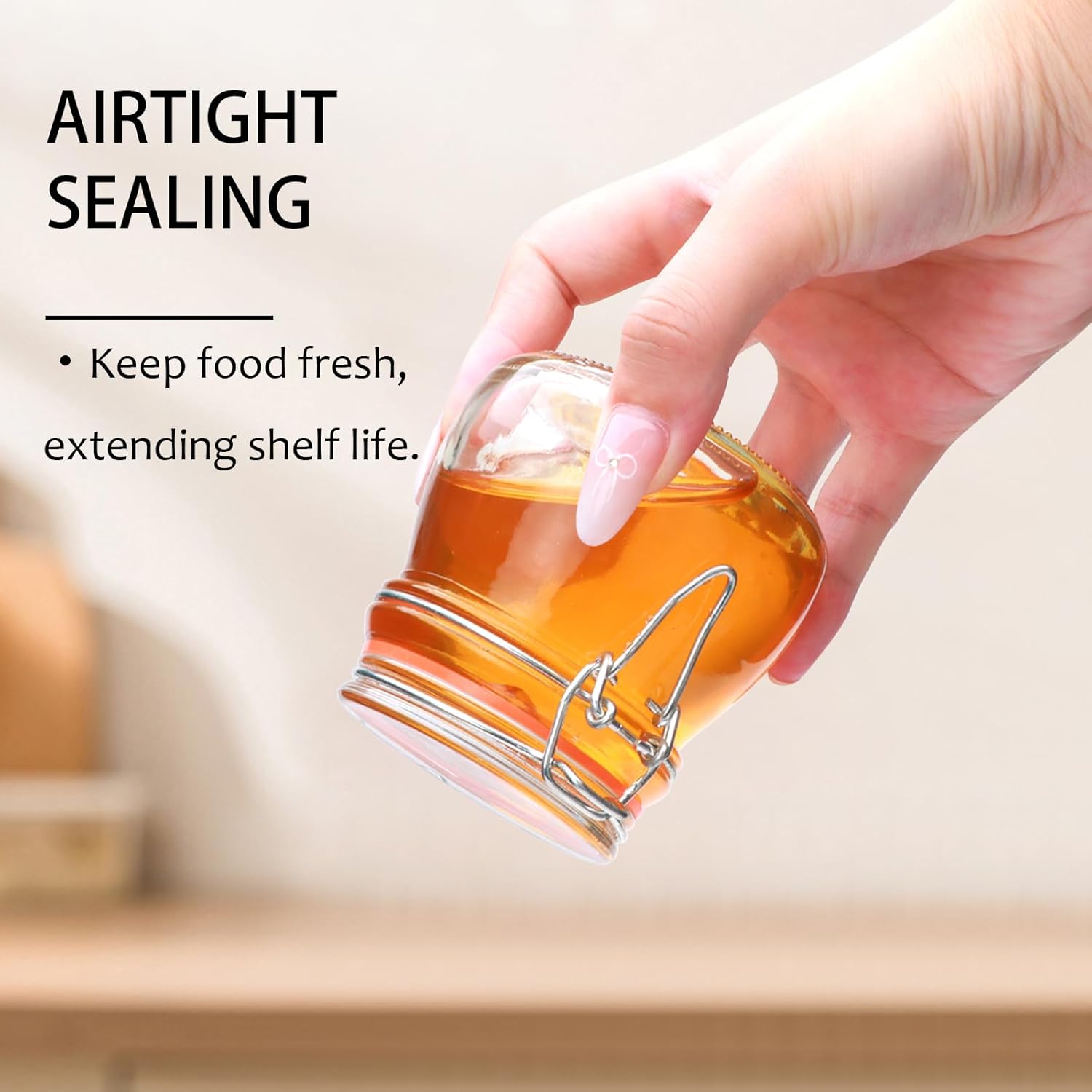 - Airtight Sealing&Keeping Fresh: Glass Jars with Airtight Lid is equipped with clamp covers with rubber gaskets that can tightly secure the lids, forming an airtight seal that helps keep the contents fresh and safe for a longer period of time. Say goodbye to outdated snacks and spices! The innovative sealing mechanism ensures that moisture and air do not affect the quality of your stored items, making it an essential storage accessory in the kitchen.