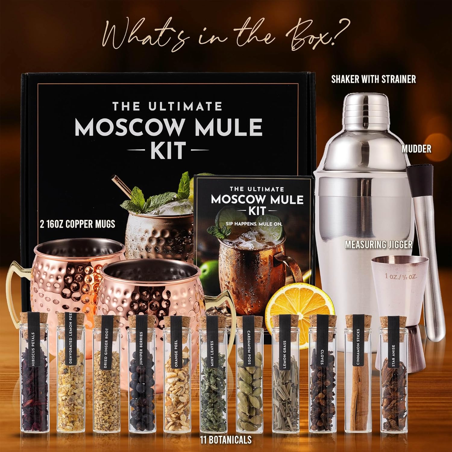 - ELEVATE YOUR MIXOLOGY GAME โ COMPLETE MOSCOW MULE KIT GIFT SET - Craft the perfect cocktail with this premium 2-copper mug mule set featuring a 550ml stainless steel cocktail shaker, jigger, muddler & 11 exotic botanicals for next-level flavor infusions