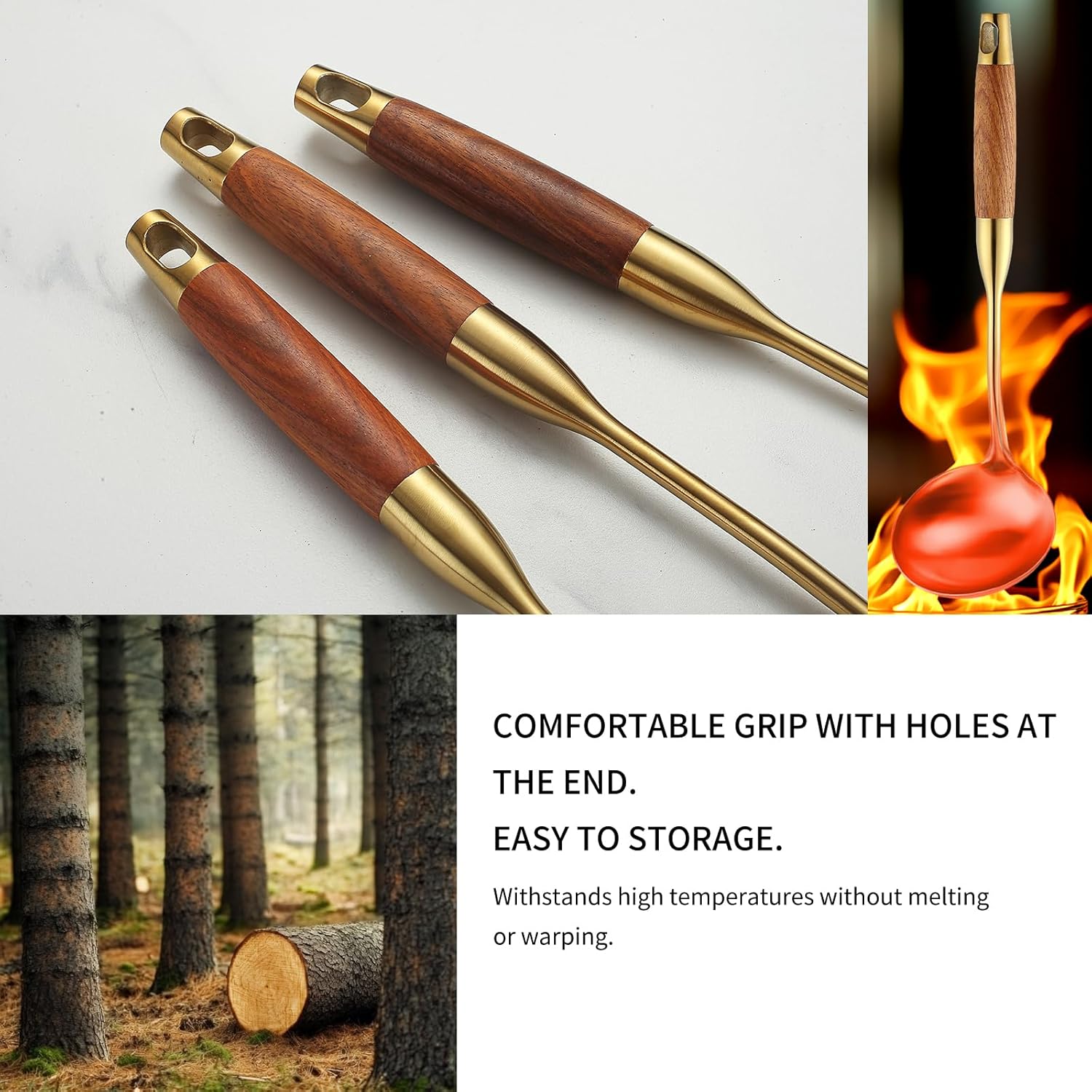 - 15inch Long Kitchen Utensil Set: Ergonomic design, idea weight, excellent grip. the unique grain of the rosewood handle is exceptionally beautiful, silky to the touch, and offers high heat resistance, the 15-inch length ensures that the chef's hands stay cool during everyday domestic or commercial use