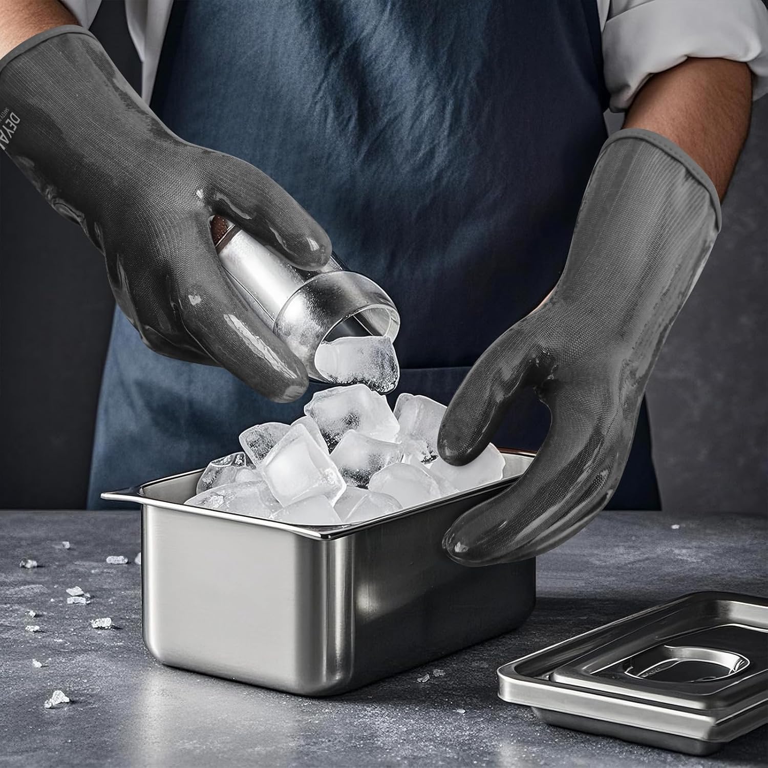 - High Temperature Resistant: Engineered to withstand extreme temperatures from -120ยฐF to 600ยฐF, these grilling gloves sustain prolonged exposure up to 480ยฐF and brief contact at peak heat, while remaining waterproof, odorless, and impervious to grease and stains even when handling hot items