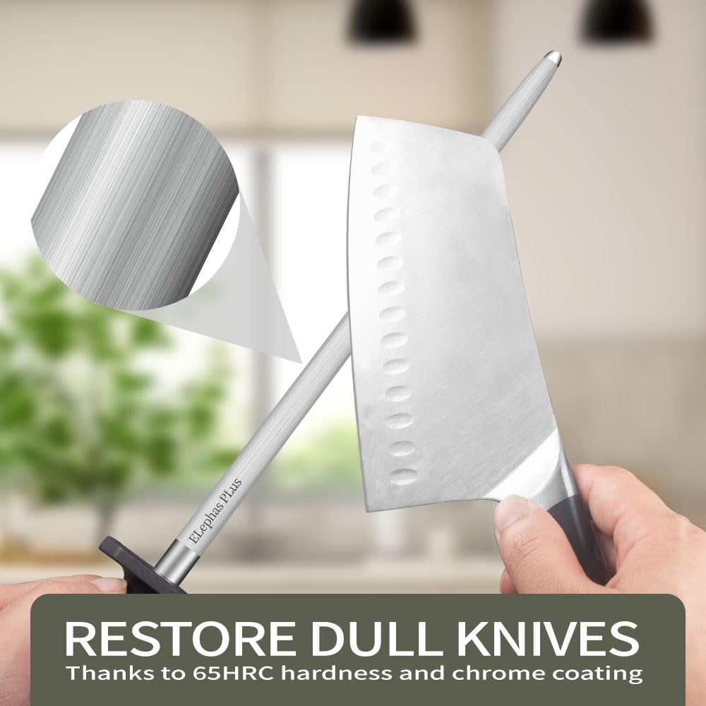 - Designed for all types of knives, the ELephas Plus Honing Steel Rod is versatile and effective, providing a razor-sharp edge with minimal effort. Its ergonomic handle ensures a comfortable grip, making the sharpening process smooth and efficient.