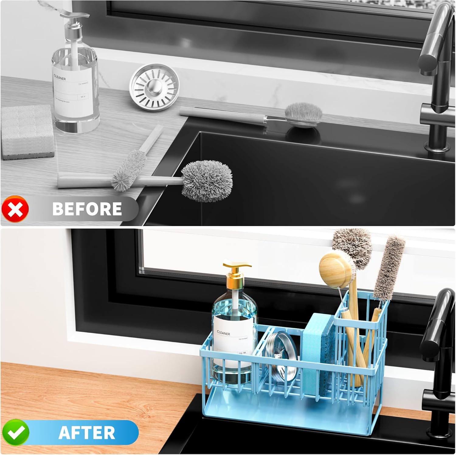 - Cisily Blue Kitchen Sink Caddy Organzier with High Brush Holder, Sponge Holder for Sink, 304 Rustproof Stainless, Kitchen Countertop Soap Dispenser Organizer, Kitchen Decor and Accessories