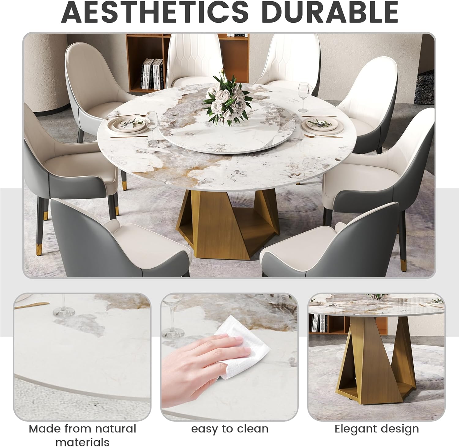Montary 59" Modern Artificial Marble Round Dining Table with Bronze Iron Metal Base & 31.5" White Sintered Stone Turntable, Dining Room Table with Lazy Susan for 6-8 (Only Table)