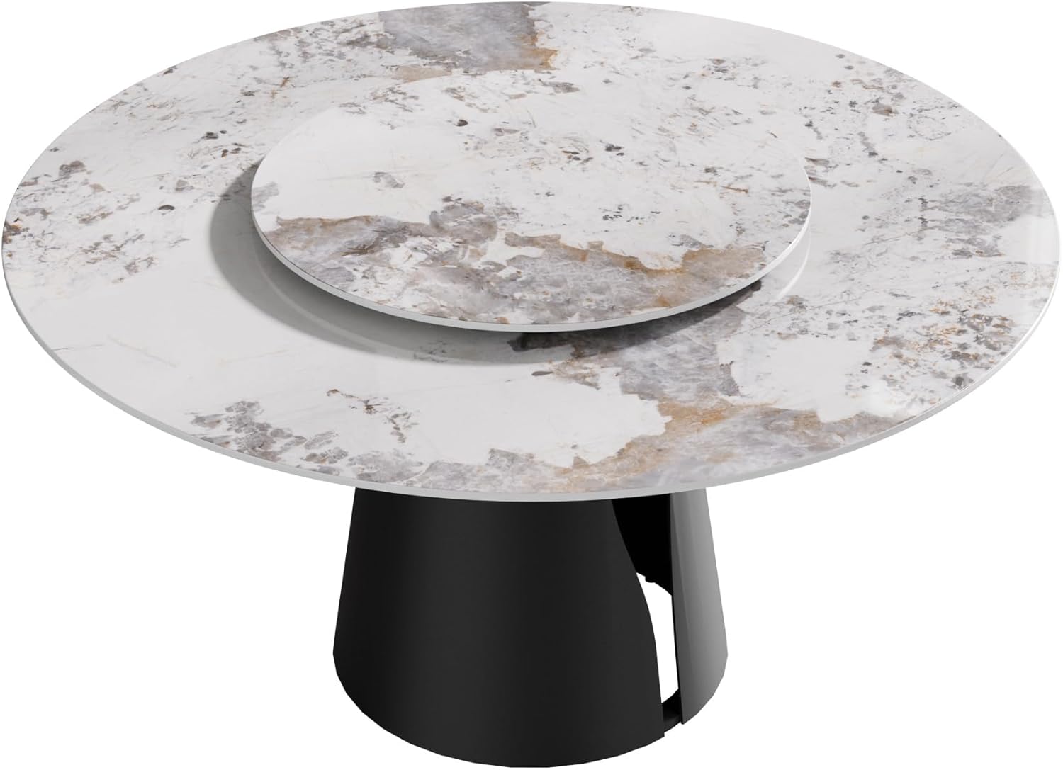 Montary 59" Modern Artificial Marble Round Dining Table with Black Carbon Steel Base & 31.5" White Sintered Stone Turntable, Dining Room Table with Lazy Susan for 6-8 (Only Table)