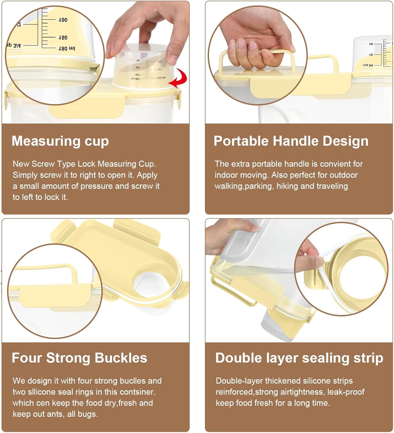 - LARGE CAPACITY:Portable rice airtight storage container capacity of 5 liters, which is very suitable for beans,Cereal,flour, sugar, oatmeal, coffee, rice, nuts, snacks, dog food, cat food, pet food, etc. (Note: The storage capacity of the container varies depending on the size of the food. Pet food can hold 5 pounds, and rice food can hold 5-10 pounds)