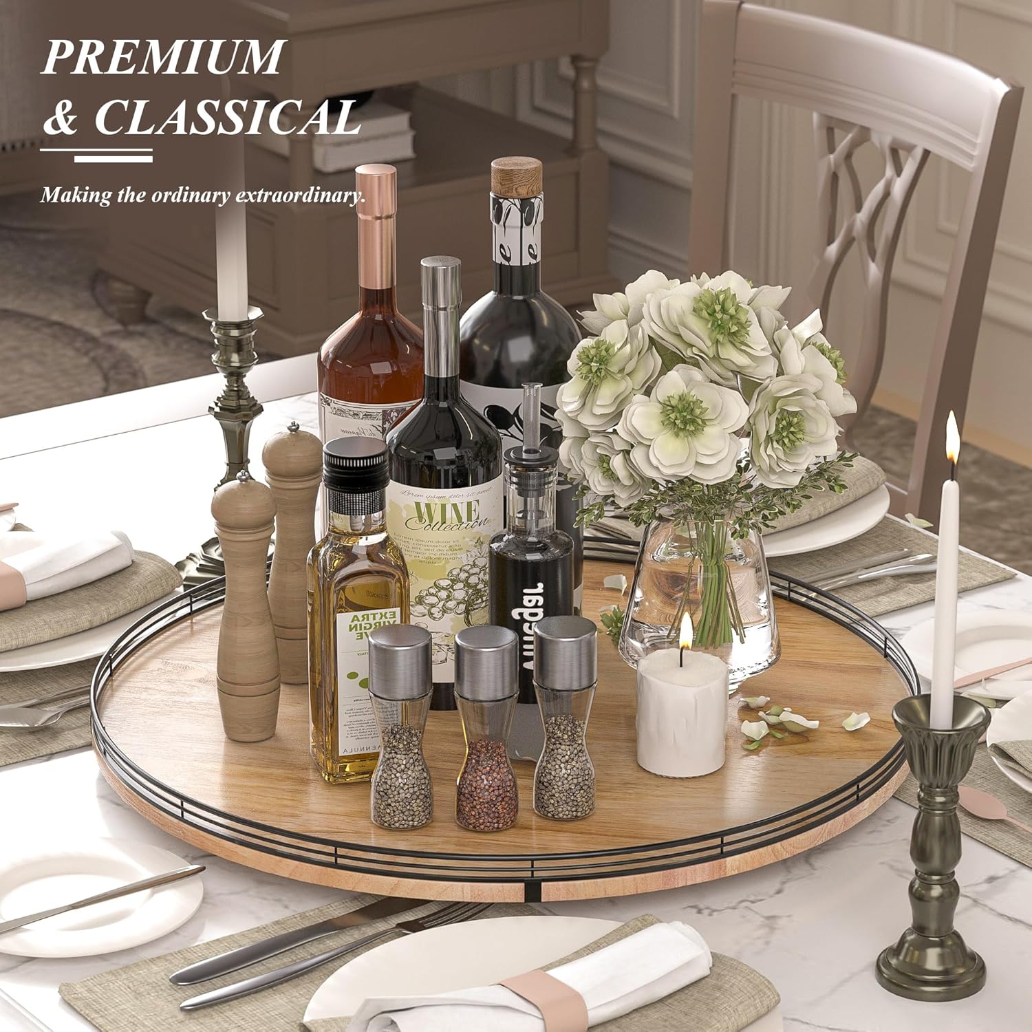 - PREMIUM MATERIAL: Our farmhouse lazy Susan organizer is made of natural solid oak wood and strong metal, sturdy, durable and premium quality. This wooden turntable organizer is a game-changer for keeping your kitchen organized. The farmhouse oak finish gives it a rustic, charming look that will fit perfectly with your kitchen decor.