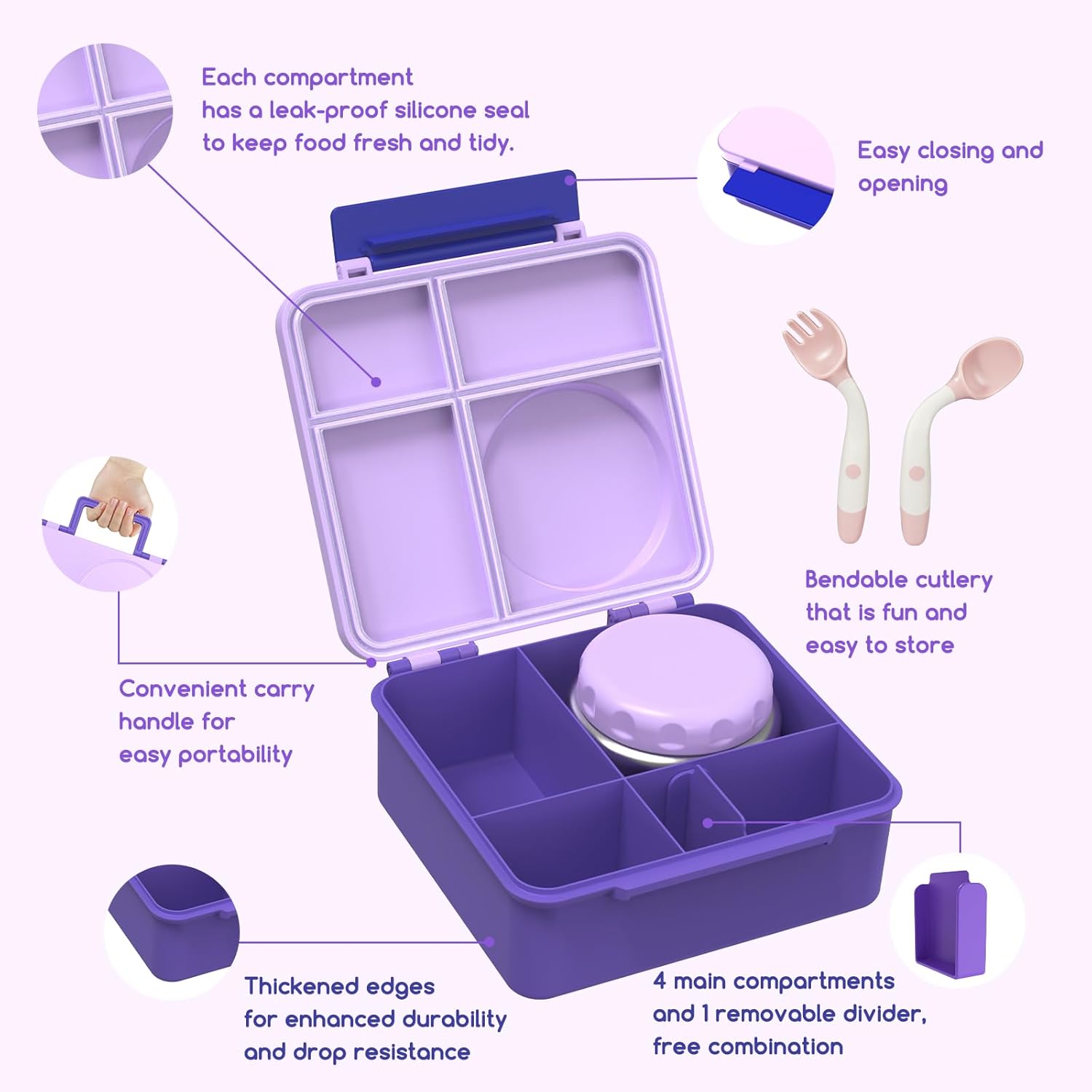 Bento Box for Kids - Leak-Proof Lunch Box with Insulated Thermos Food Jar - 4 Compartments, 1 Removable Divider, 1Spoon, 1 Fork - Dishwasher Safe, BPA-Free (Light purple)