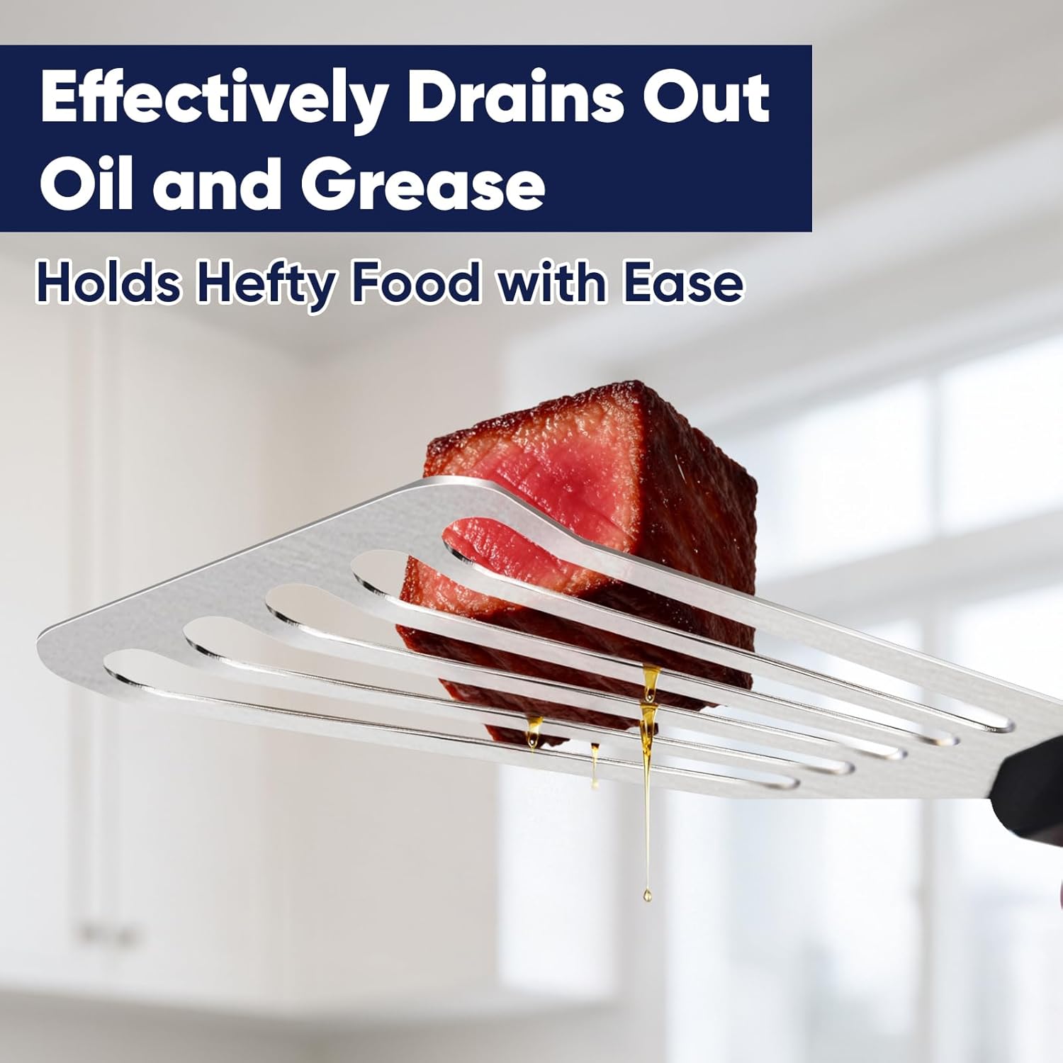 - Holds Hefty Food with Ease β our metal turner can be used at barbecue party to make burgers on an outdoor grill as it can easily hold the weight of a half-pound patty