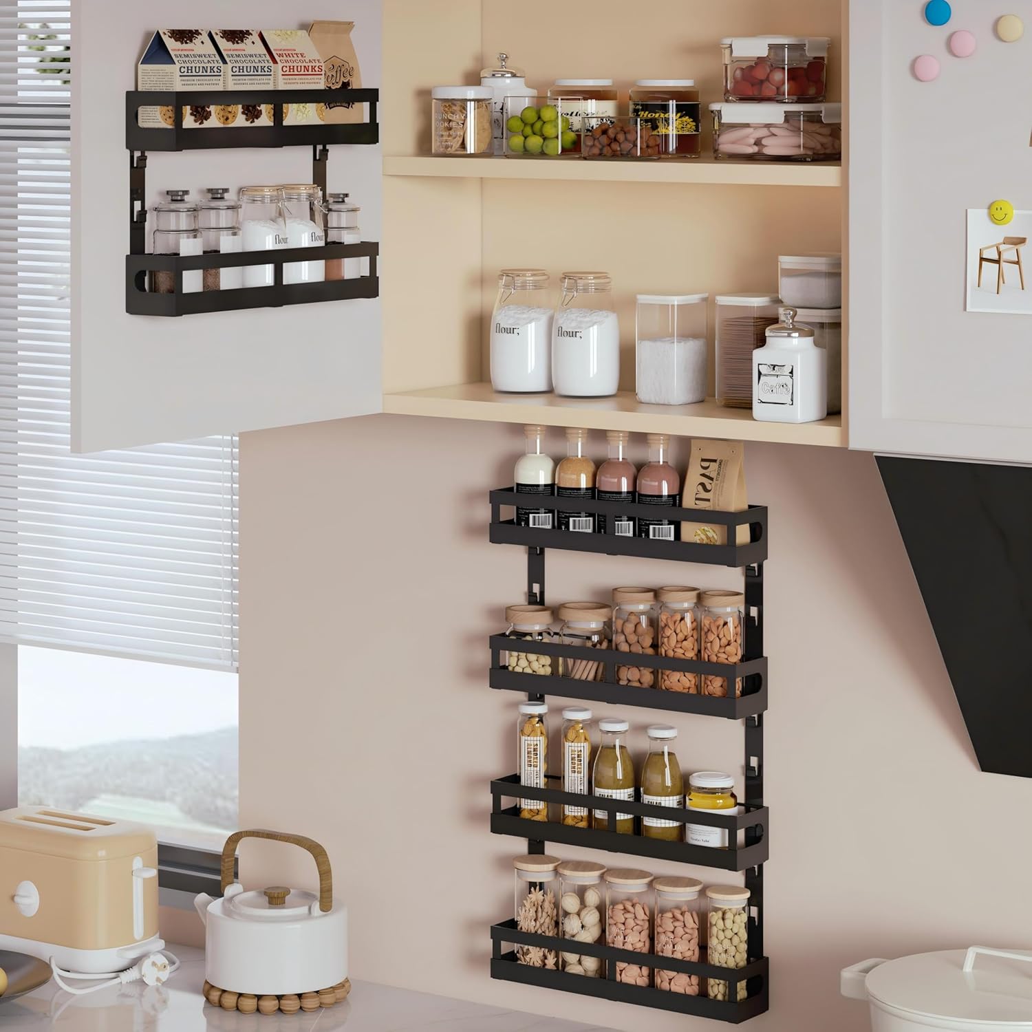 - [Height-Adjustable Shelves] Customize the height between each tier to fit spice jars, baking supplies, or small condiment bottles. Organize taller or shorter items with ease!