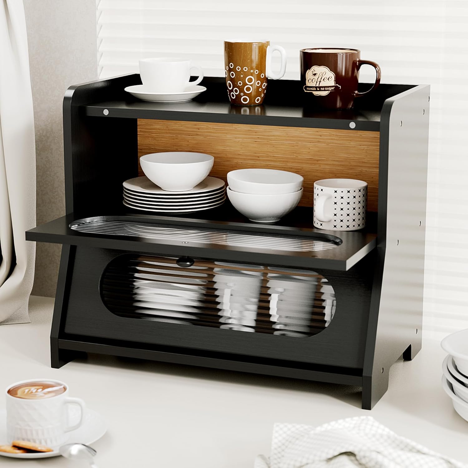 - Stylish Design & Easy Assemble: The tilt-down lower door and magnetic top door offer easy access.Transparent acrylic panels ensure visibility and security of the contents, making it easy to view internal storage.The farmhouse bread box comes with all the necessary accessories and clear assembly instructions for easy assembly