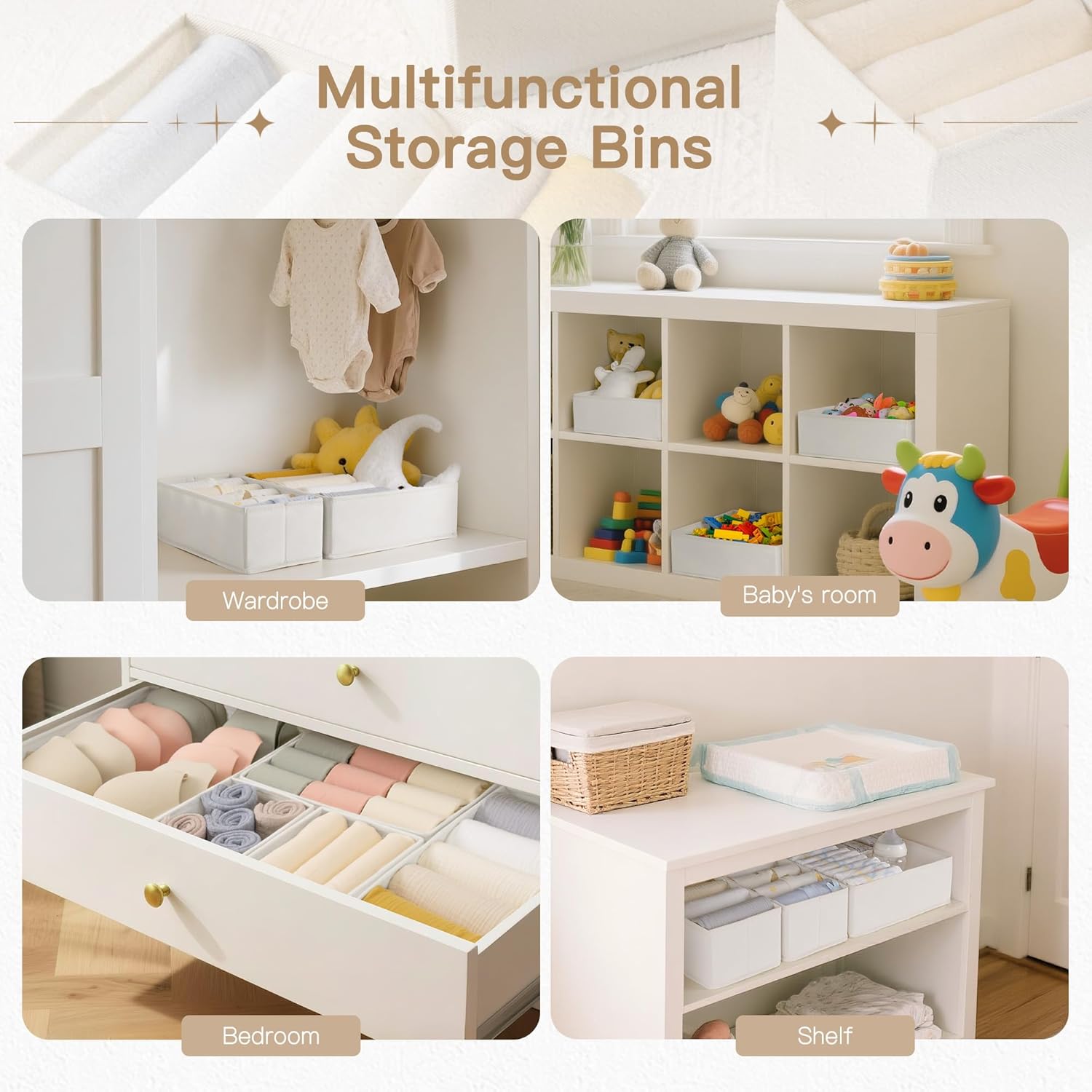 - Multi-Use: Transform any space in your home with our drawer organizer bins! Perfect for bedrooms, living rooms, offices, and kids' rooms, they maximize storage potential. Ideal for organizing baby clothes, socks, underwear, bras, and more