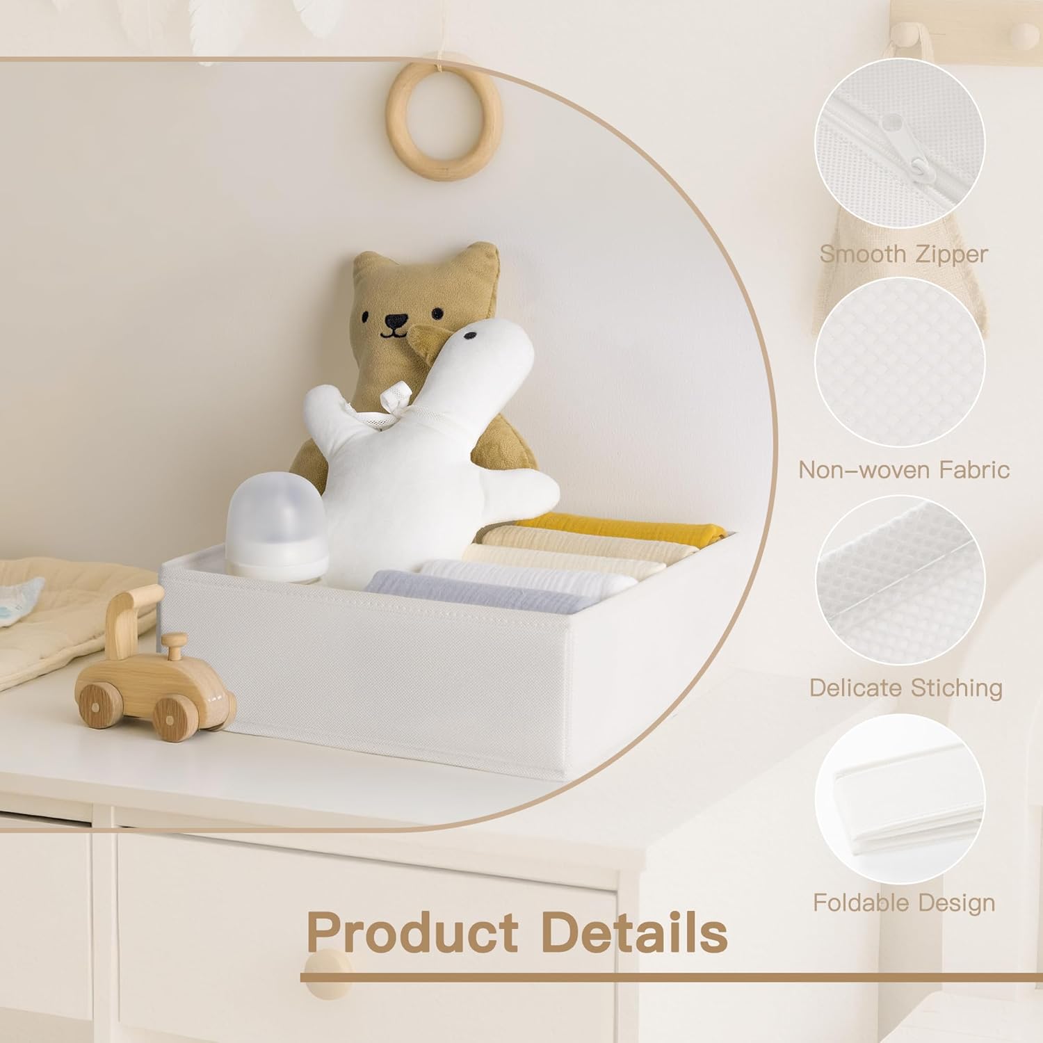 - Durable Design: Crafted from sturdy non-woven fabric, these drawer dividers feature high-quality stitching for enhanced durability. Reinforced with heavy plastic boards on the sides, the bottom features a convenient zipper. They are also odorless, making them ideal for storing baby clothes