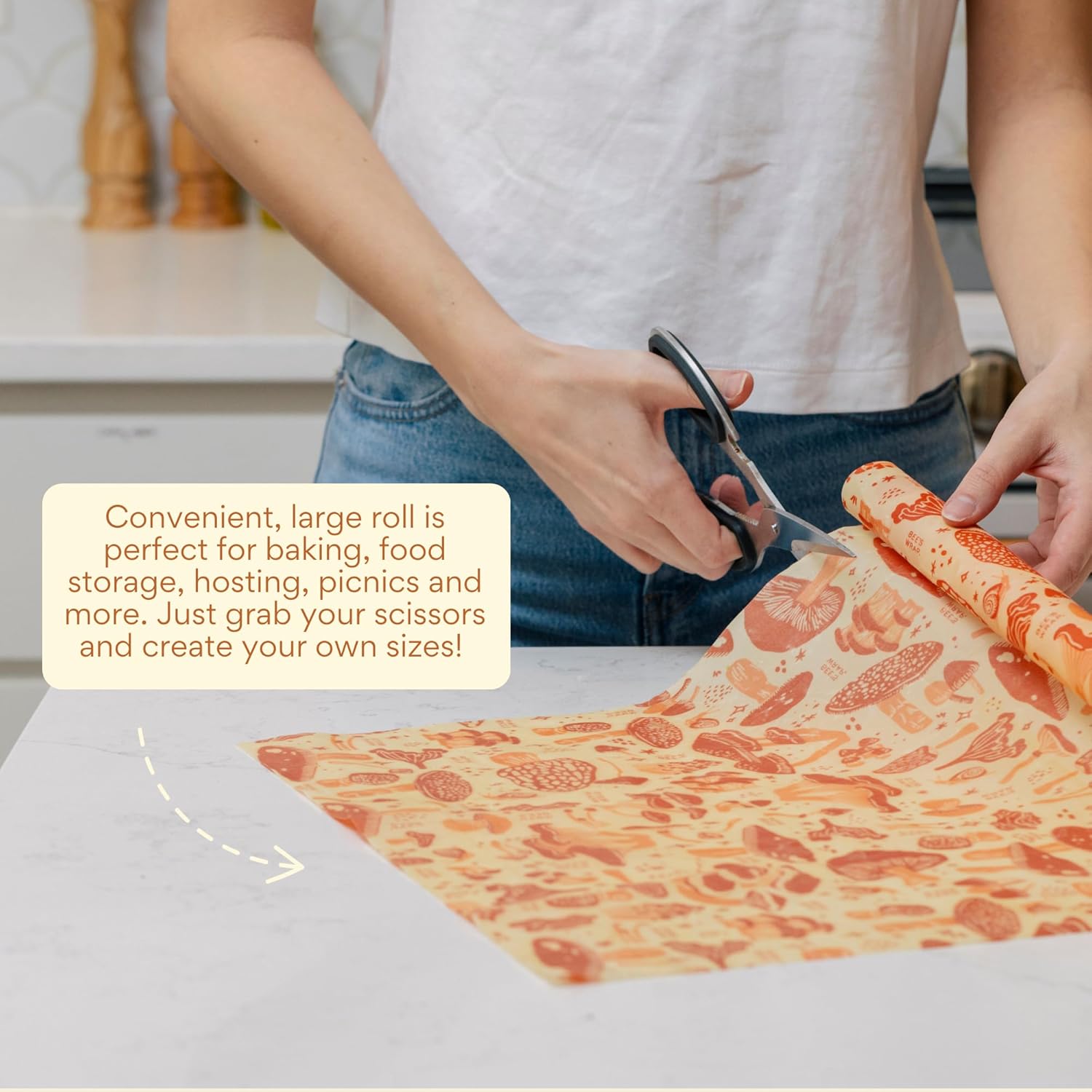 - BEESWAX WRAPS FOR FOOD in a large 14" x 52" wax paper roll featuring a colorful mushroom design. Made in USA reusable beeswax food wraps are a great alternative to single use plastic wrap, sandwich wraps, and aluminum foil.