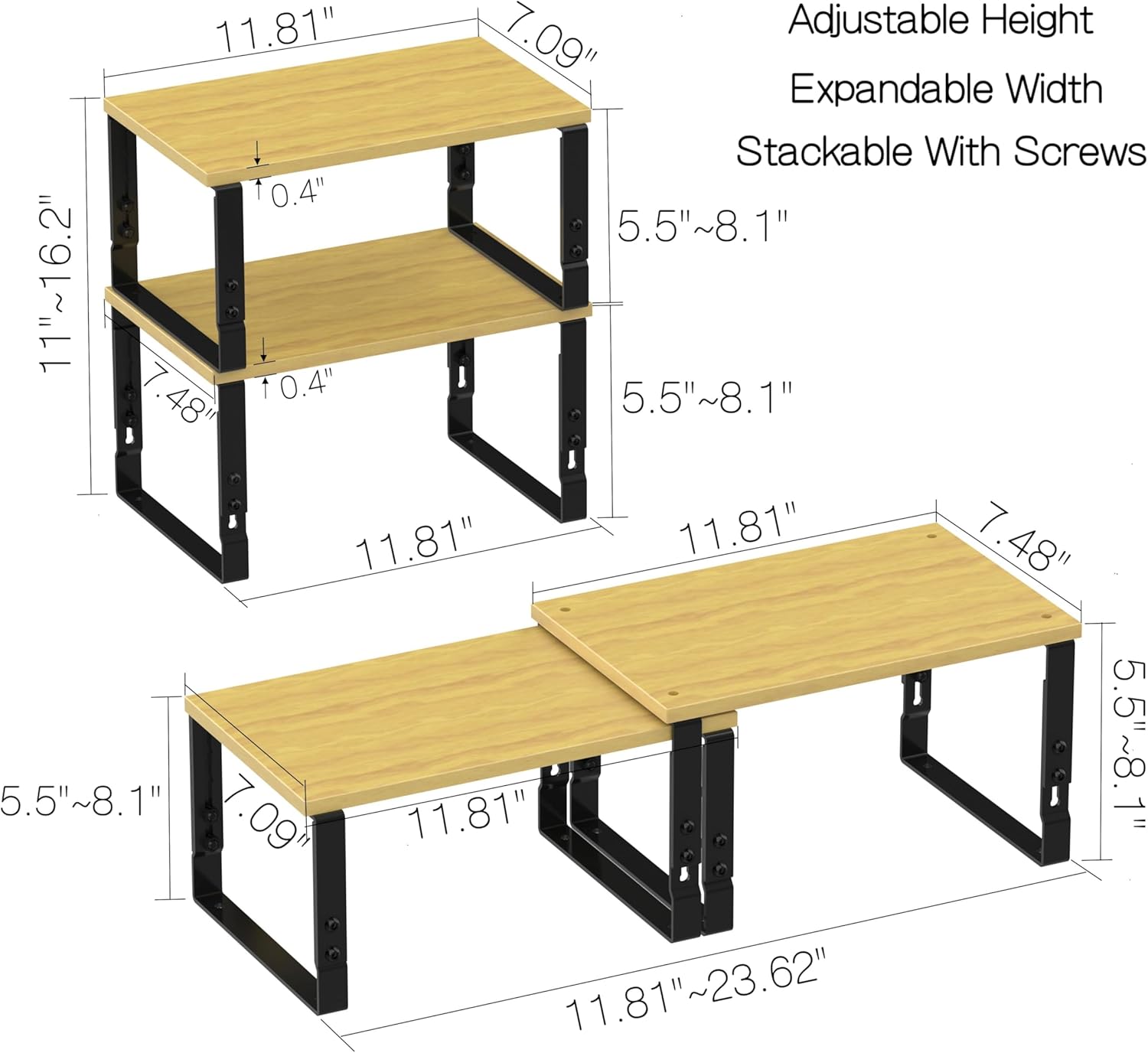 - ✅ Tailored Storage, Endless Possibilities:Unlock flexible organization with height-adjustable shelves! Mix-and-match small (11.81"Wx7.09"Dx5.5"-8.1"H) and large (11.81"Wx7.48"Dx5.5"-8.1"H) units to create a custom storage solution. Stack vertically for compact spaces or expand horizontally to maximize capacity,Perfect for kitchens, pantries, garages, offices, and more!