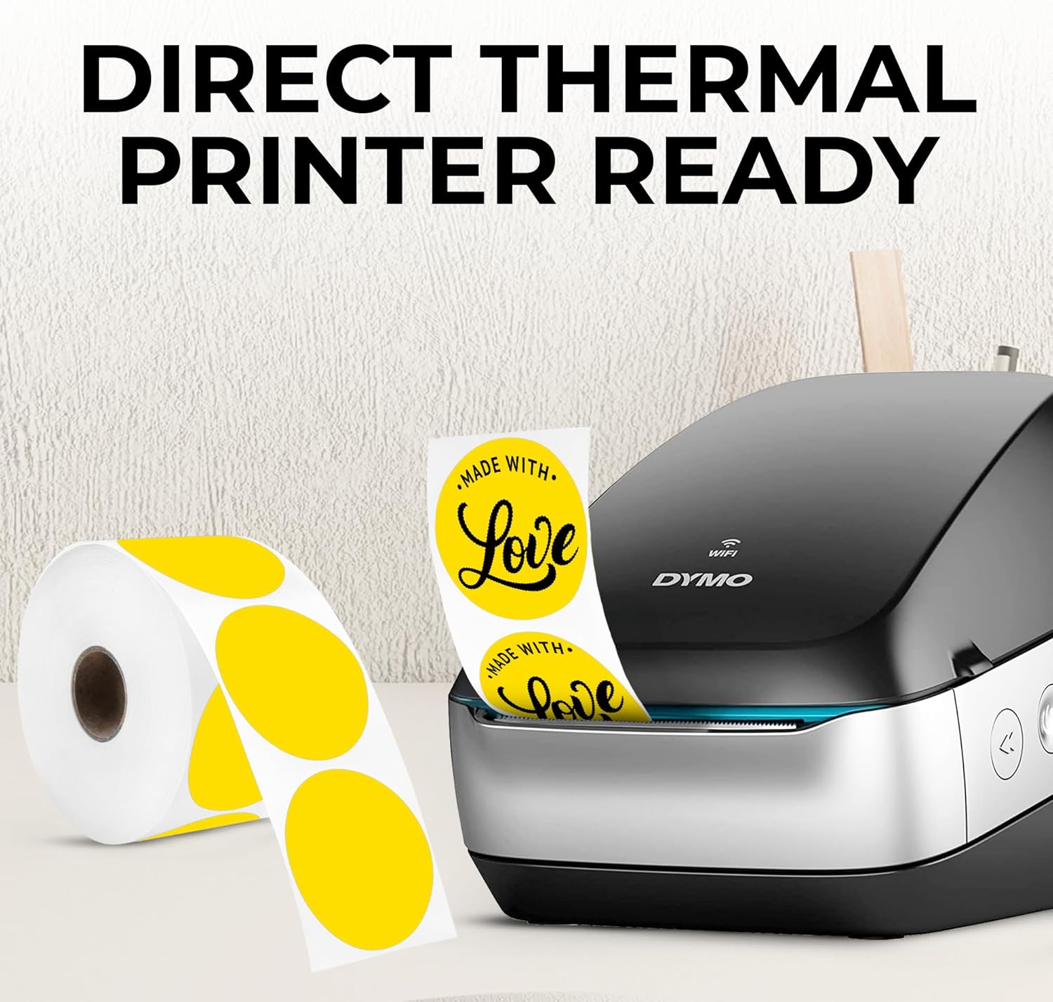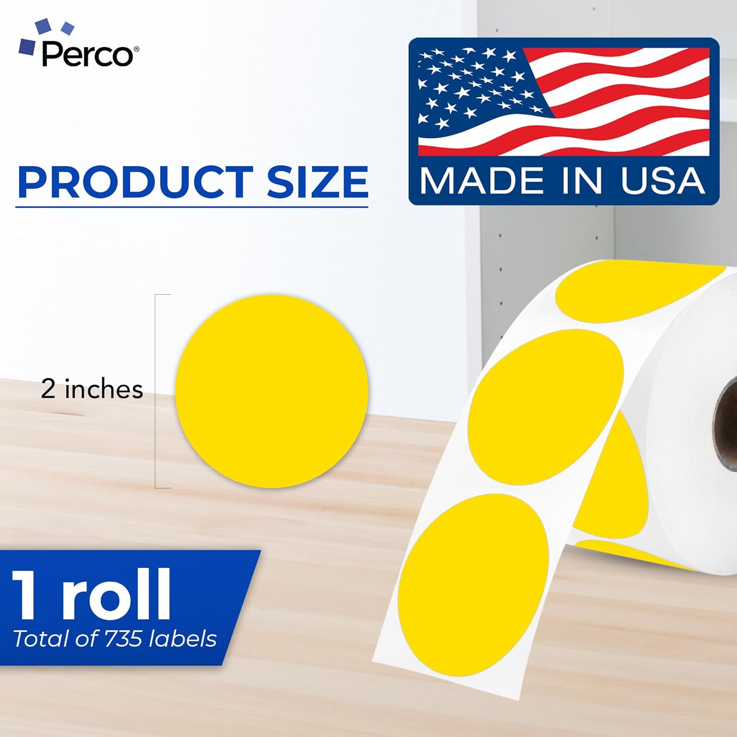 Perco Yellow 2-Inch Perforated Circle Dot Thermal Sticker Labels — 735 Stickers/Roll, Direct Thermal Printer Compatible—with Permanent Adhesive for Organizing, Color Coding, Bin Labeling—Made in USA