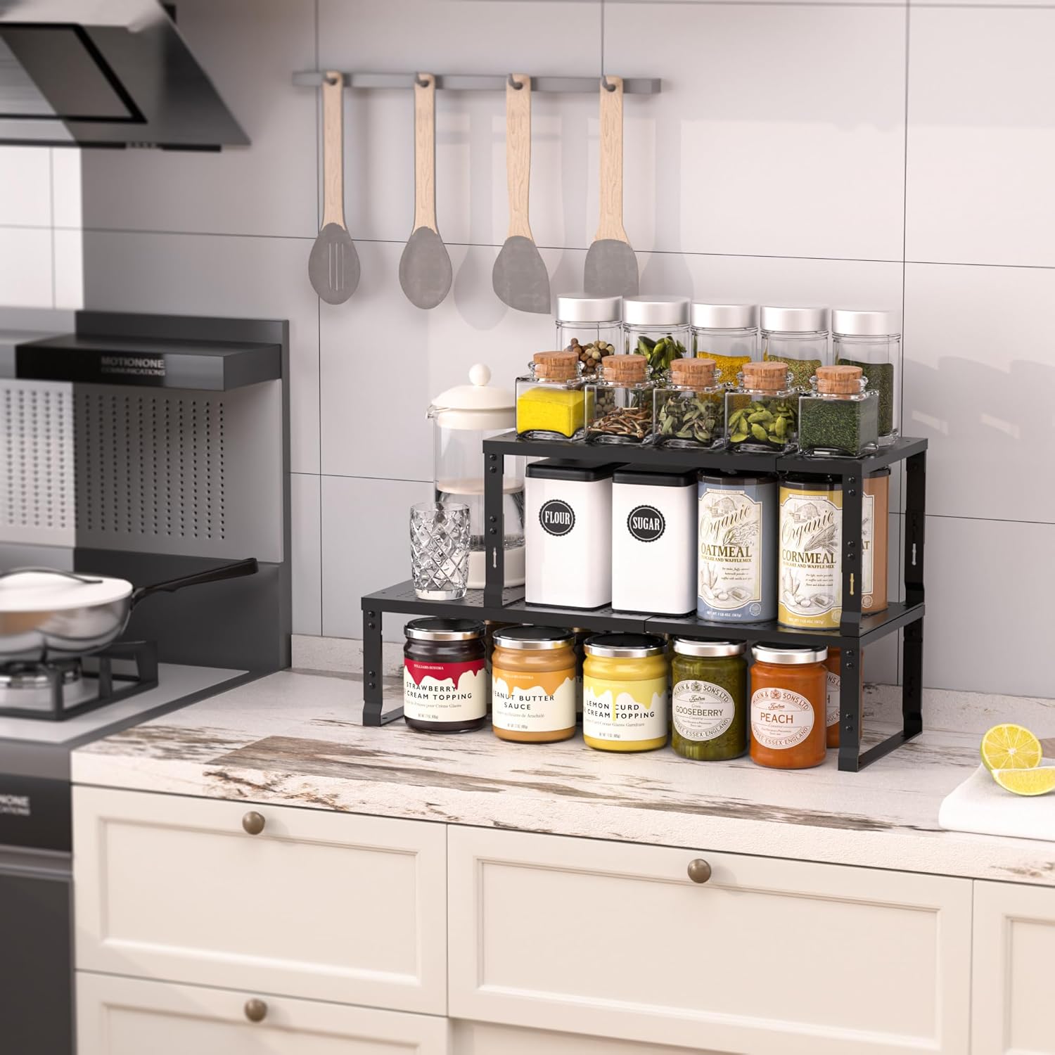Heavy-Duty Adjustable Metal Shelf Organizer - Expandable & Stackable Pantry Storage Rack for Kitchen, Bathroom, RV, Cabinets(2 Packs/Black, Large)