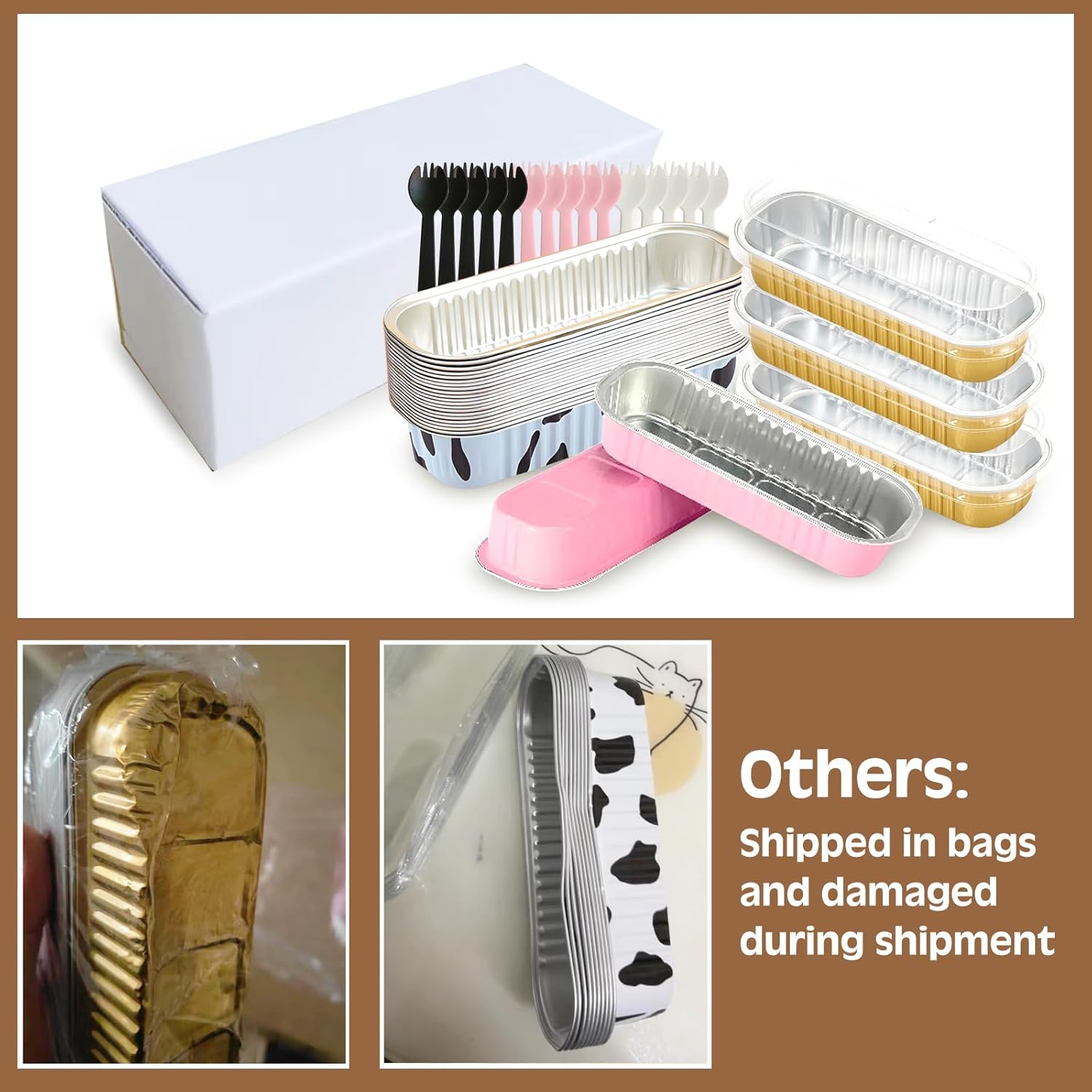 25 PCS Multiple colors Mini Loaf Pans with Lids and Spoons, 6.8oz Mini Cake Pans for Baking, Disposable Aluminum Foil Loaf Pans, Loaf Baking Pans for Party Individual Serving.