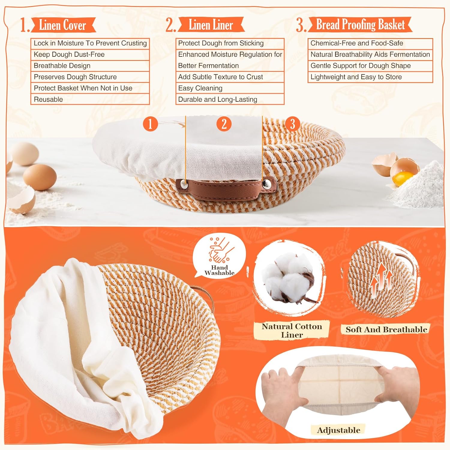 - 🥖THOUGHTFUL WOVEN BASKETS DESIGN FOR PERFECT PROOFING - Food-Grade Cotton Material For Safe Proofing. The slightly textured surface of the woven material also leaves a beautiful pattern on the crust, adding an artisanal touch to your homemade bread that’s sure to impress. The woven structure of the cotton rope basket provides just the right amount of tension and air circulation needed for perfect dough proofing. It’s also lightweight and easy to store—fold it gently when not in use, or hang it up as a decorative accent that showcases your love for baking.