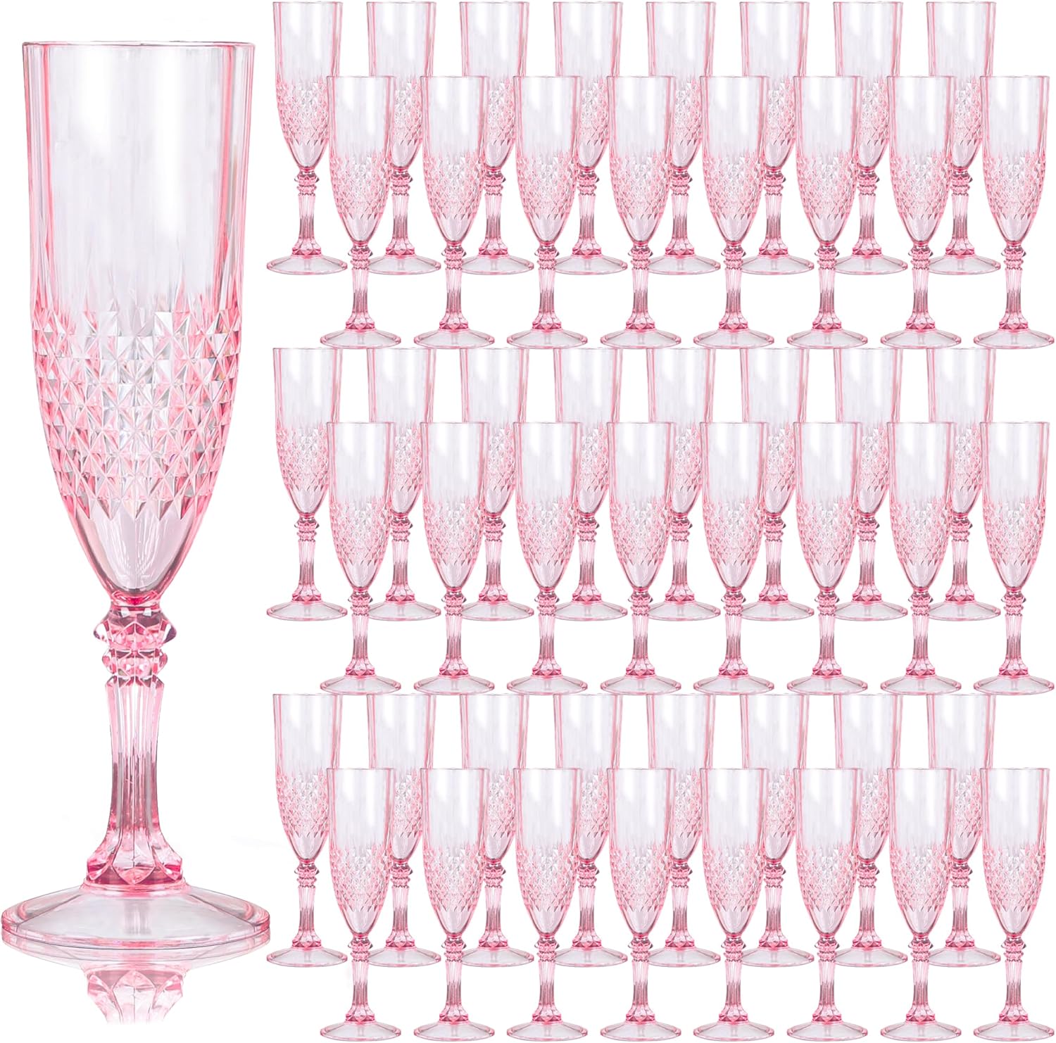 - Charming Set: Champagne flutes set include 48 retro-style pink champagne plastic wine glasses, providing ample quantity to meet your daily use and replacement needs. A suitable champagne cup is the icing on the cake. Plastic wine glasses not only carry the wine, but also carries the laughter and blessings