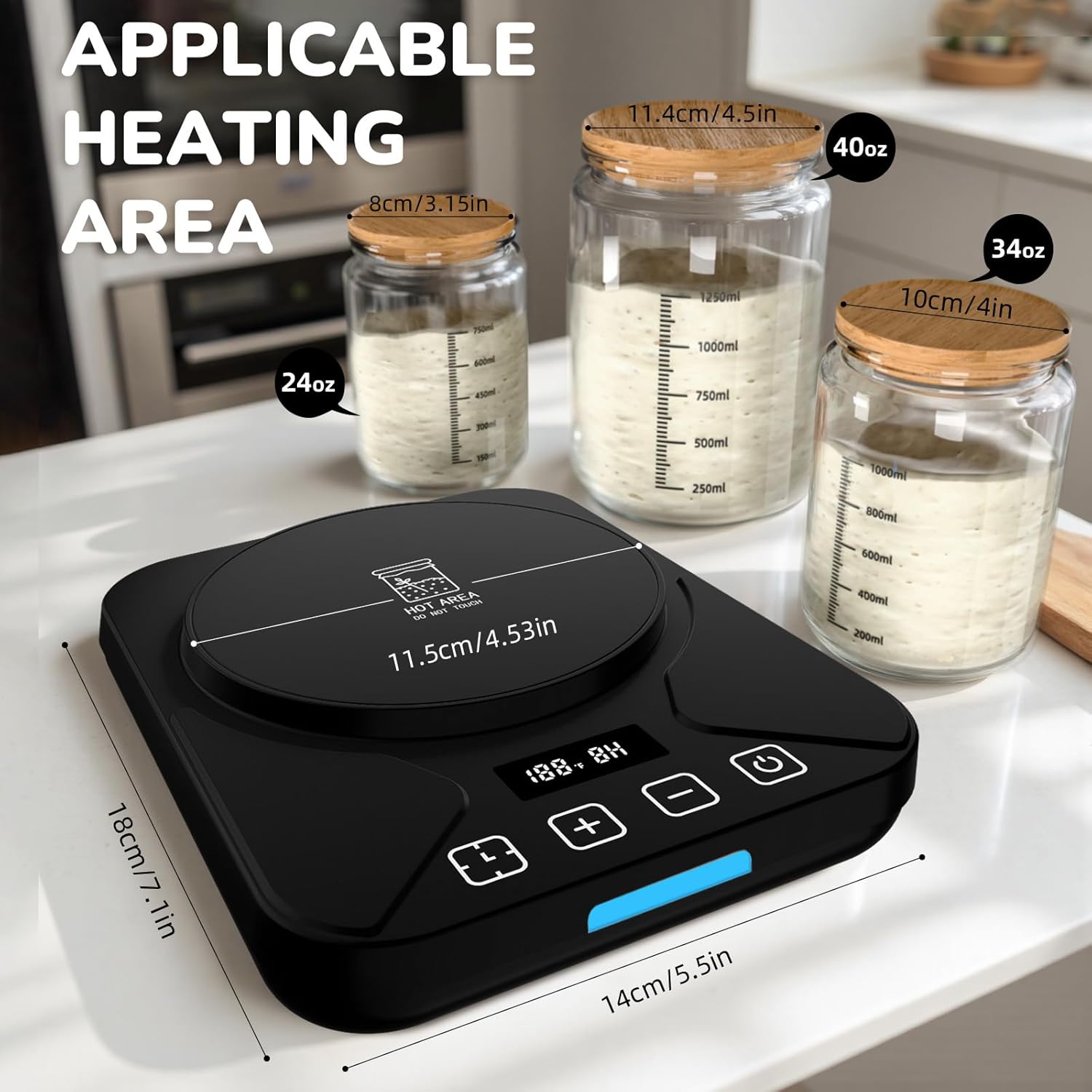 Sourdough Starter Warmer Mat - 24H Timer - Precise 1°F Thermostat Control (70-100°F) - Smart Memory Warming On/Off - Fits Jars Up to 40oz - Perfect for Home Baking (Black)