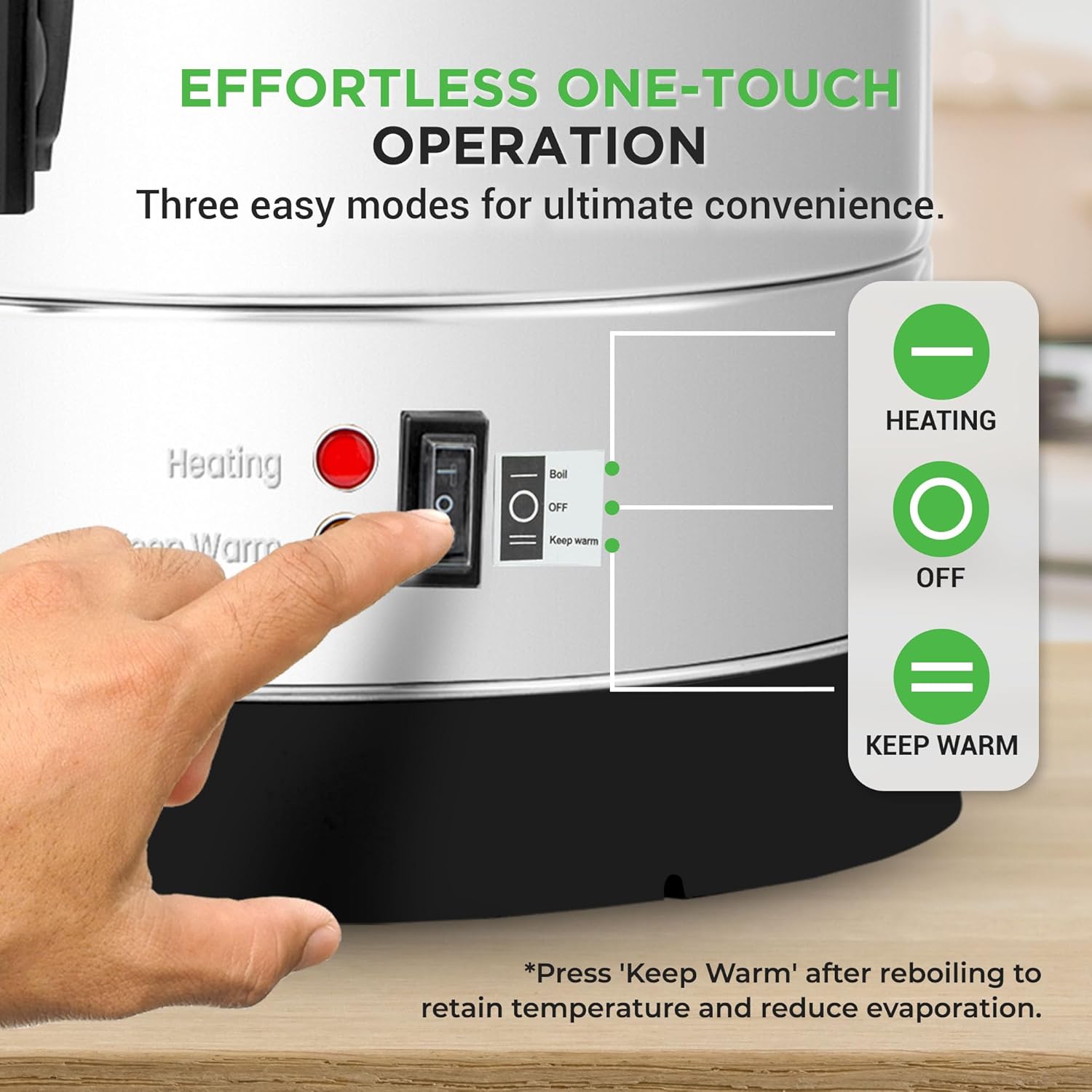 - LARGE-CAPACITY WATER BOILER - This 19-liter hot water dispenser is perfect for brewing beverages or dispensing hot water for parties, offices, or large households. Made with food-grade stainless steel, it combines durability with style.