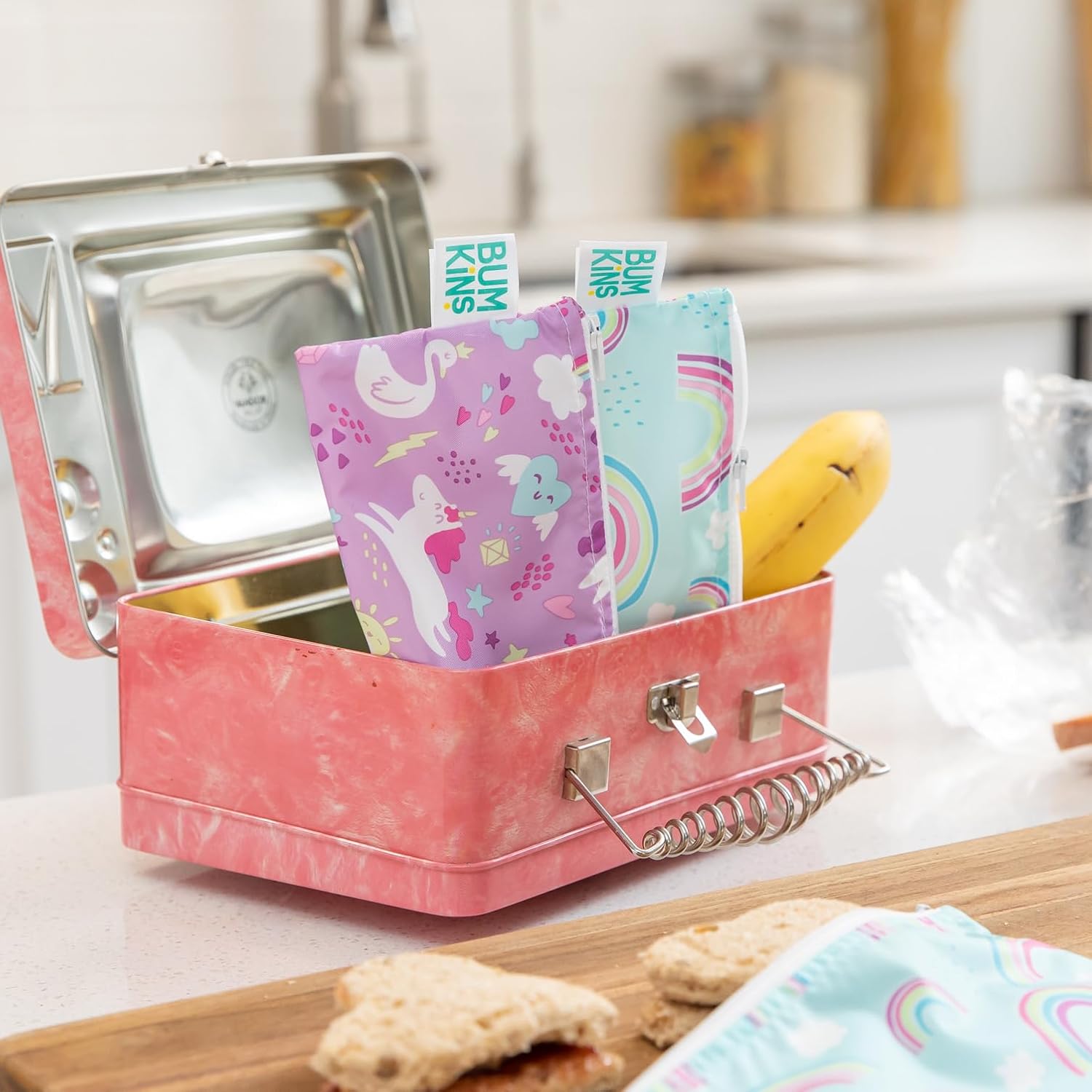 - REUSABLE CLOTH BAGGIES - Made with Bumkinsβ signature waterproof polyester fabric embedded with TPU, this 4 pack includes 2 small snack bags (3.5β³β―Γβ―7β³) and 2 large sandwich bags (7βΓ7β). These bags offer a fun yet functional alternative to single-use plastic bags.